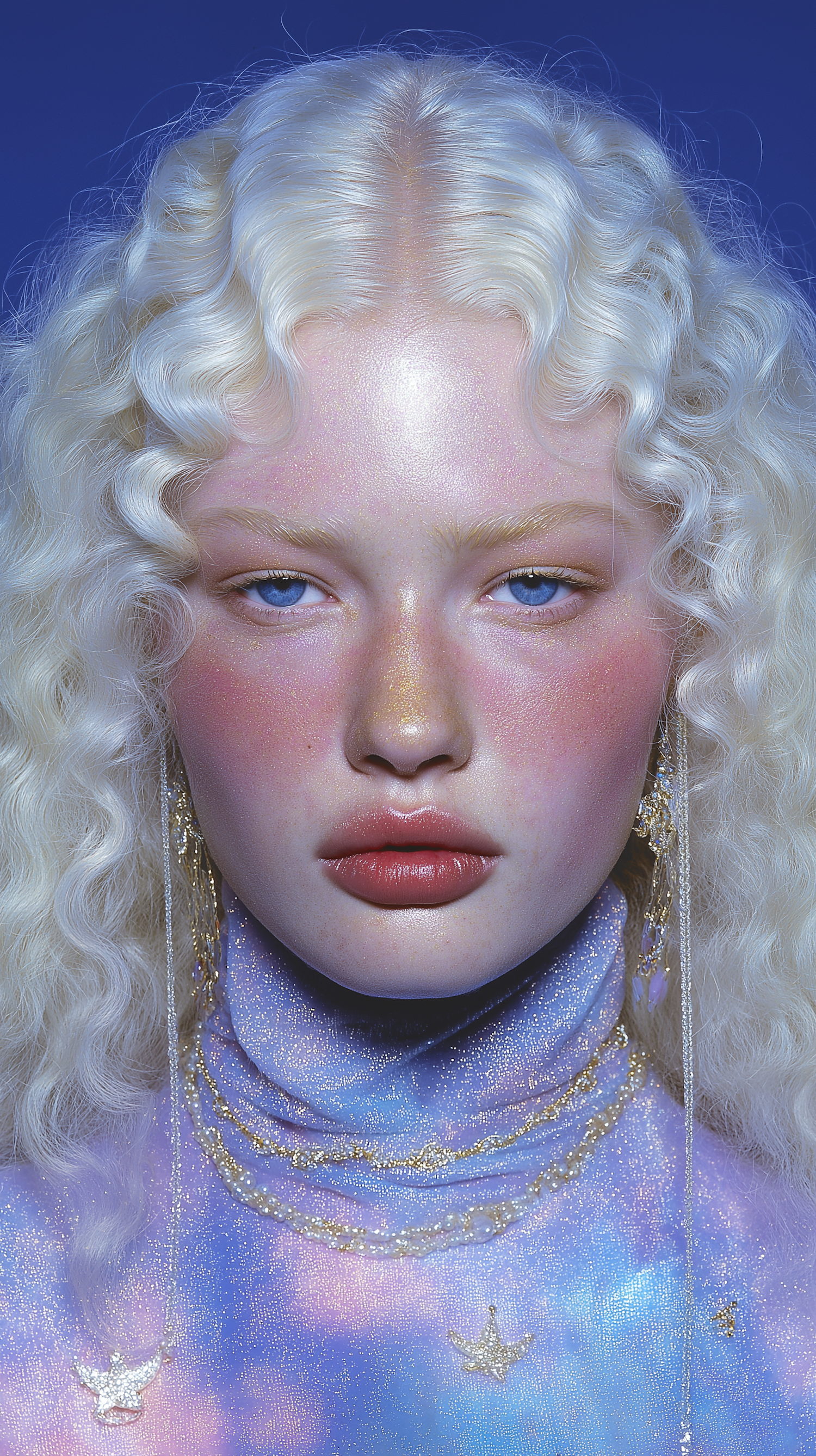Ethereal close-up of a person with platinum blonde curls, blue eyes, and shimmering pastel attire against a deep blue background.