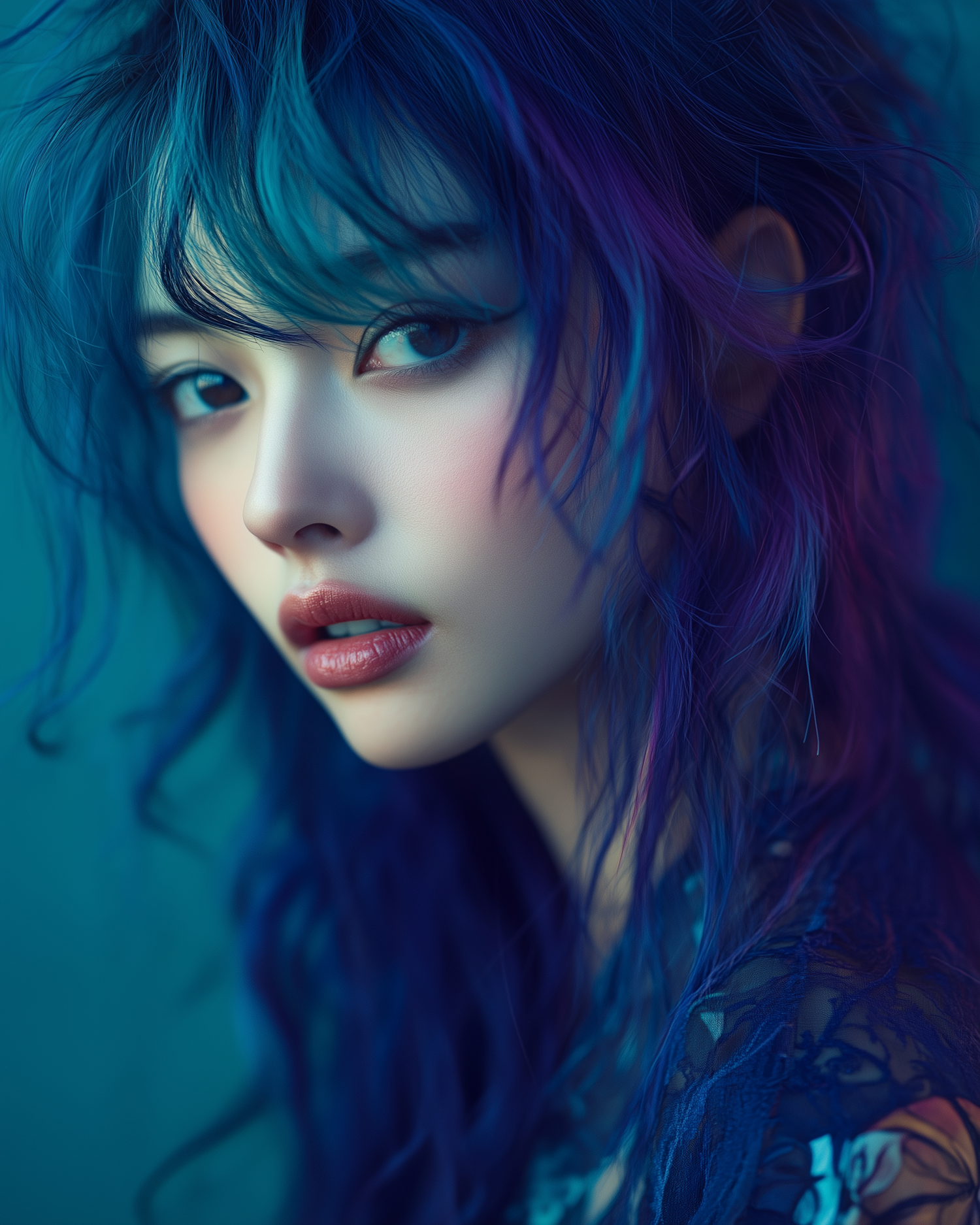Close-up of a woman with vibrant blue and purple hair, fair skin, and soft makeup, set against a teal background.