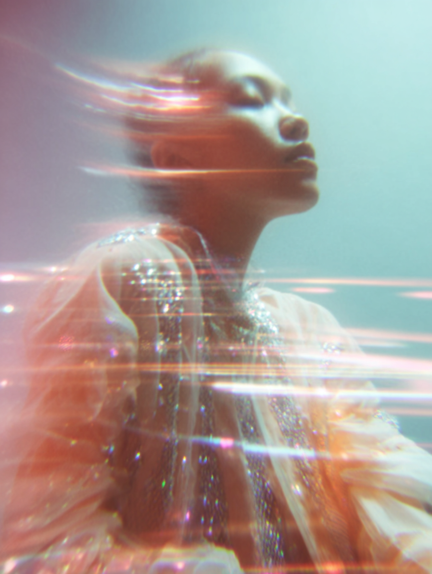 A serene portrait with shimmering details and ethereal light streaks, creating a dreamy and surreal atmosphere.
