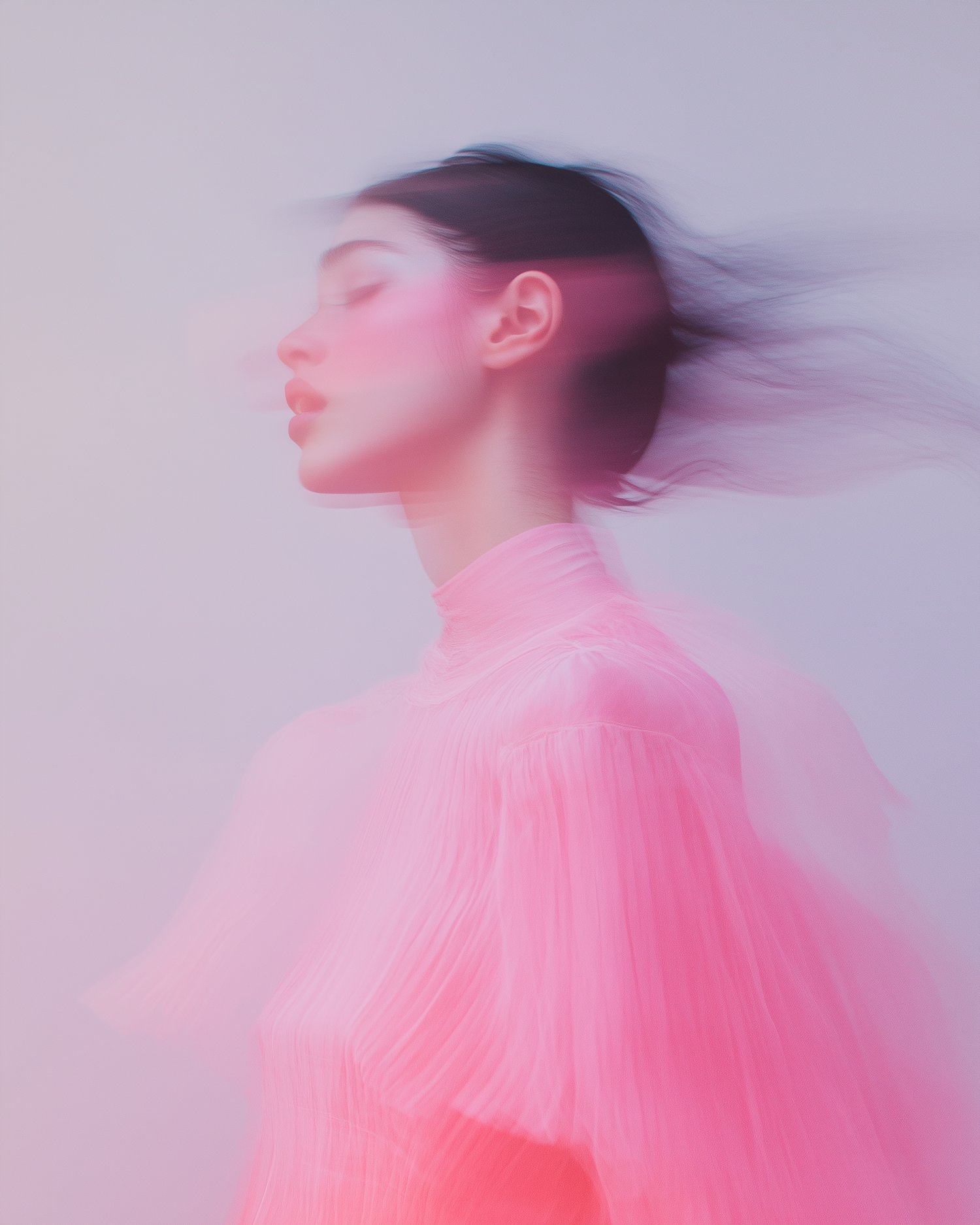 Ethereal portrait of a woman in motion, wearing a pink dress with blurred effects and soft pastel colors.