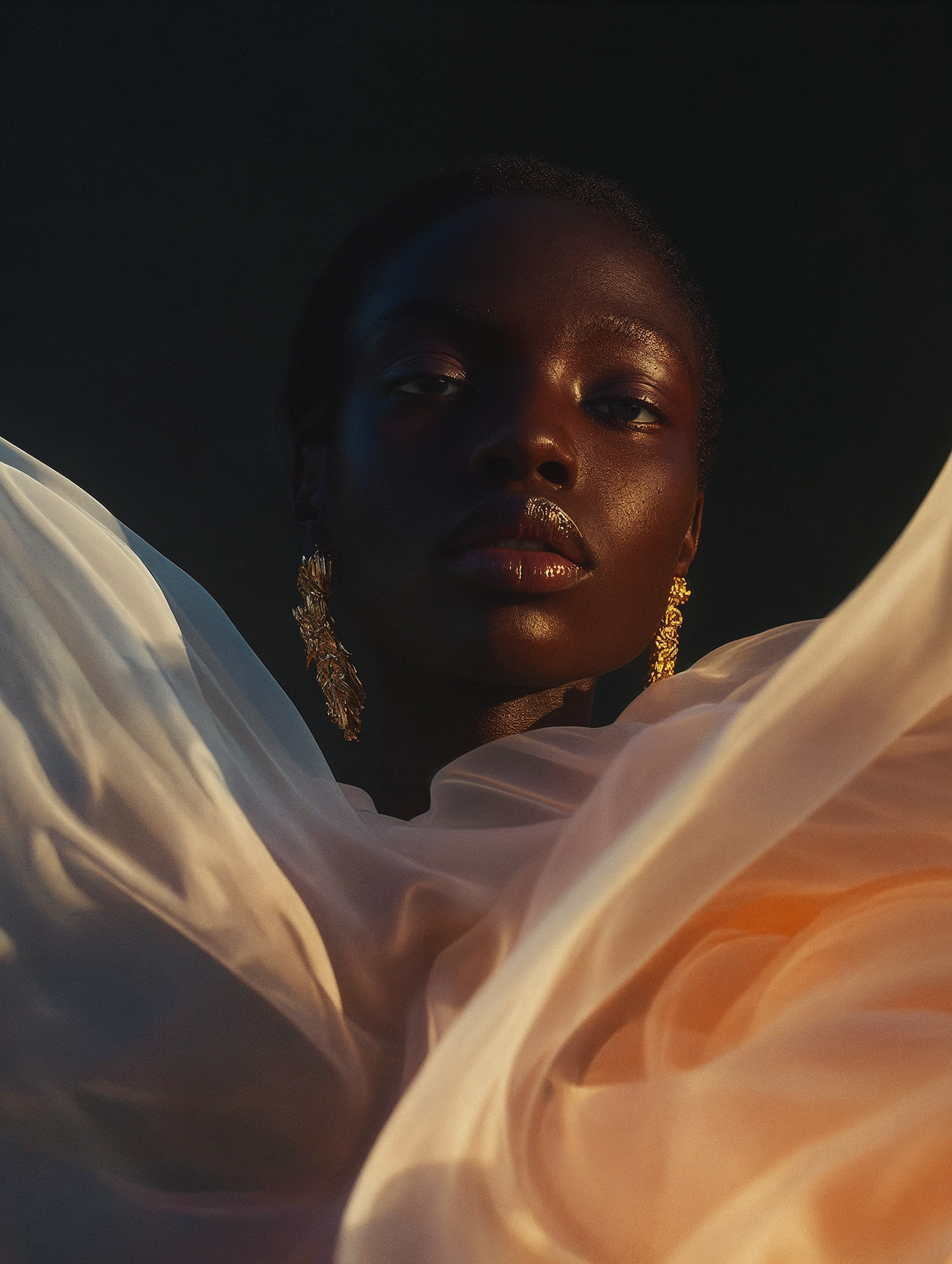 A stunning portrait of a Black woman with golden earrings and flowing fabric, bathed in warm, dramatic lighting.