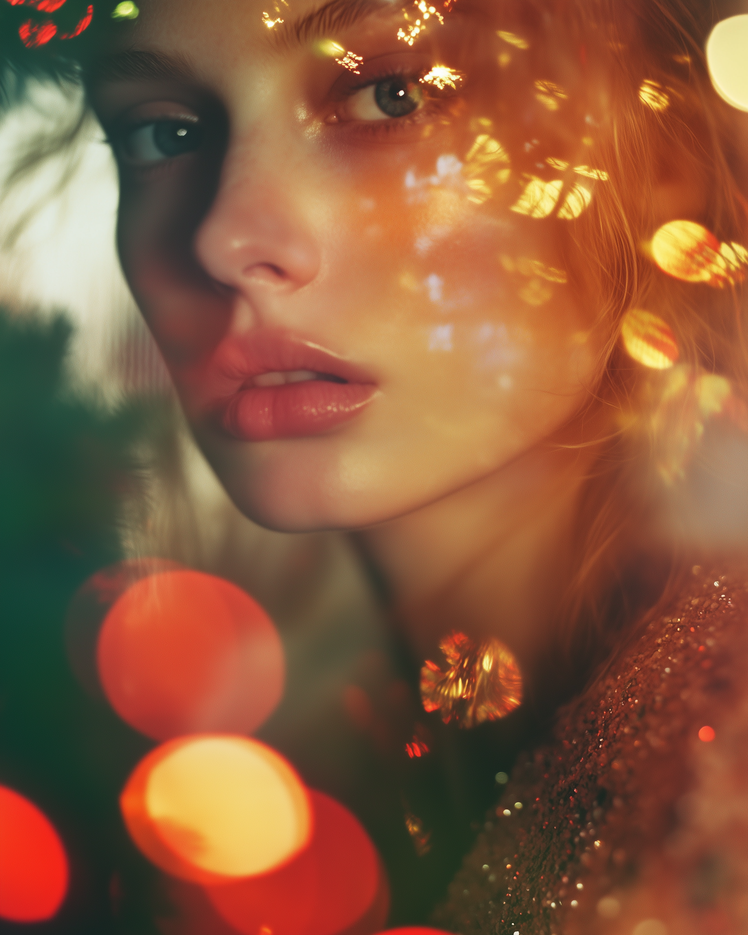 Ethereal portrait of a young woman with bokeh lights, featuring warm tones and a dreamy atmosphere.
