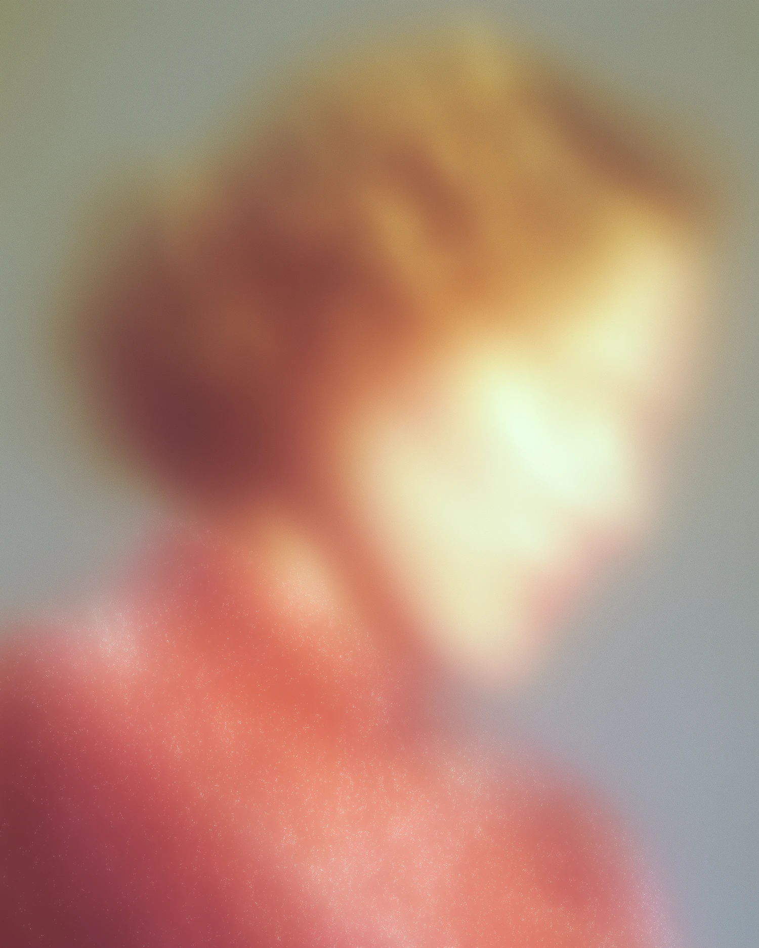 A blurred, warm-toned abstract image of a person with light hair and a red sparkling garment, creating a dreamy and ethereal effect.