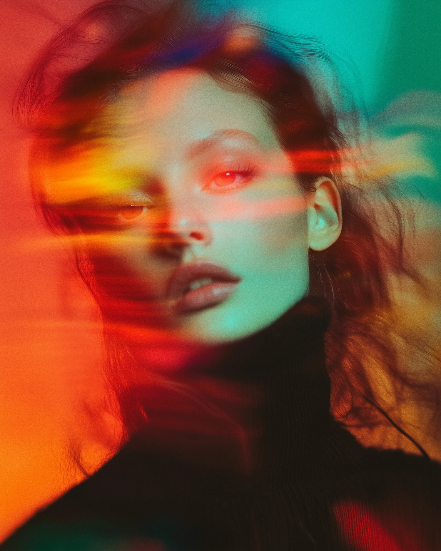 Abstract portrait of a woman with vibrant red, orange, and teal colors creating a dreamy, ethereal atmosphere.