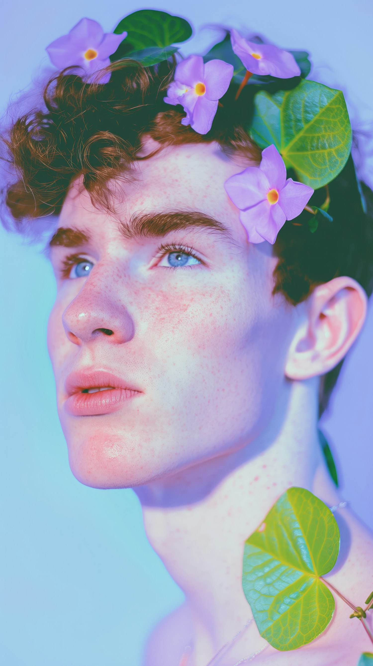 Young man with curly hair adorned with purple flowers and green leaves, gazing upward against a light blue background.