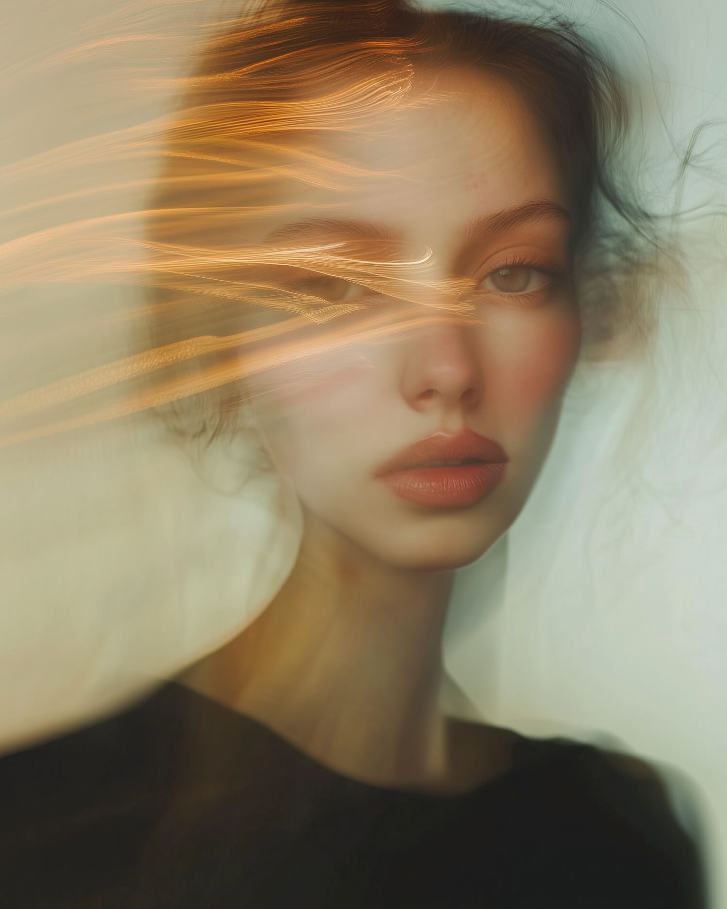 Surreal portrait of a young woman with golden light trails across her face, blending realism and abstract art.