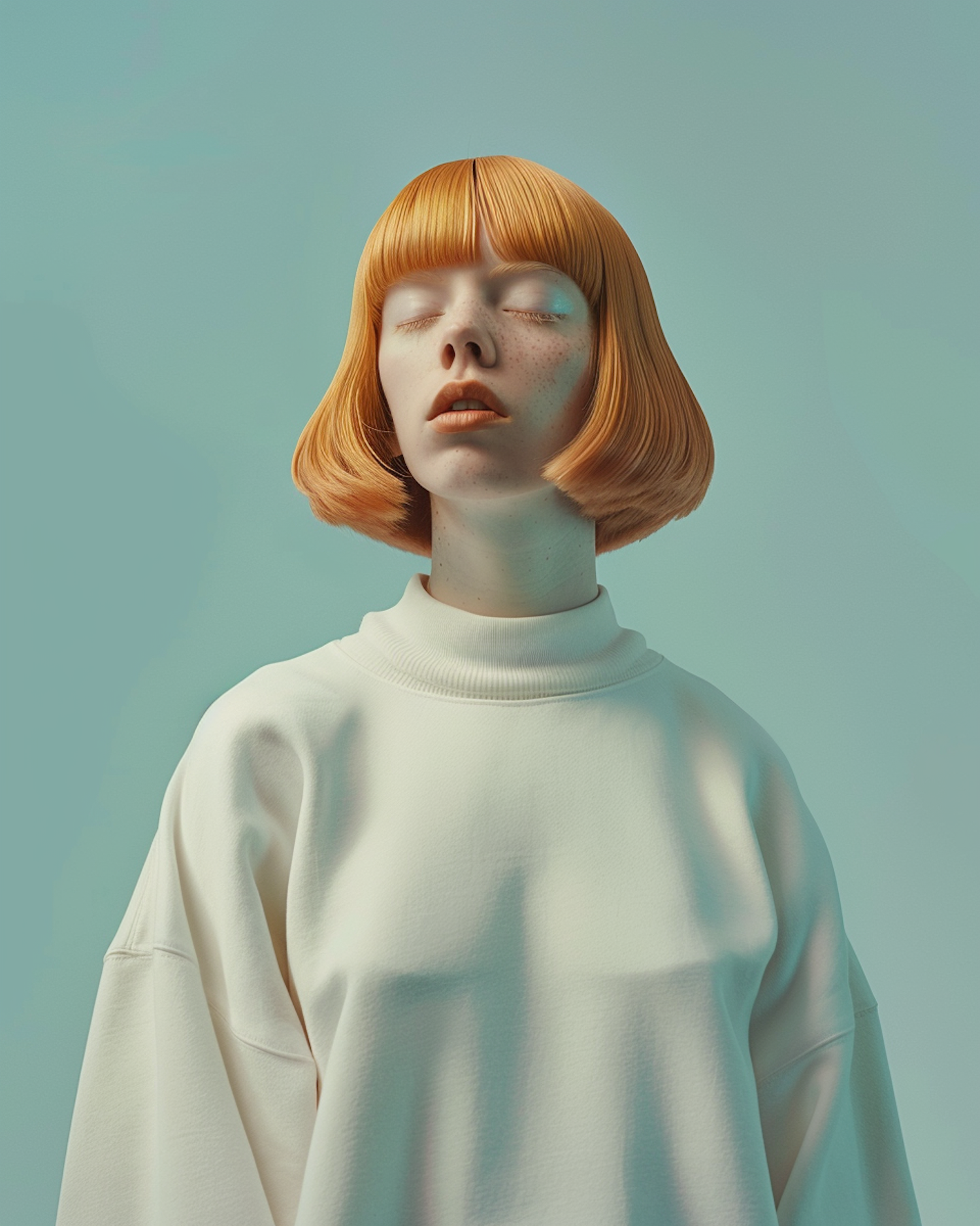 Serene portrait of a woman with orange bob haircut and closed eyes, wearing a white sweatshirt against a teal background.