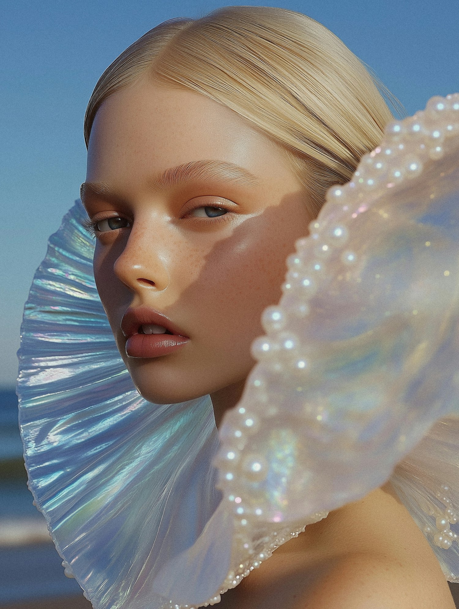 Close-up of a woman with blonde hair and iridescent seashell collar, set against a clear blue sky. Ethereal and elegant portrait.