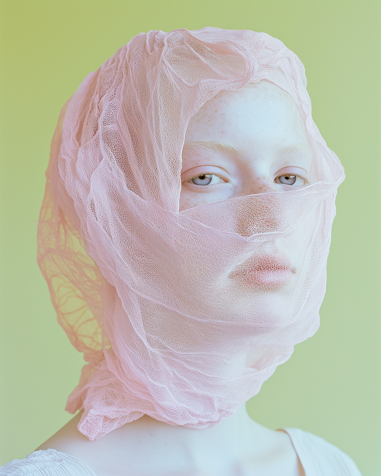 A serene portrait of a person with light blue eyes, wrapped in pink translucent fabric against a pastel green background.