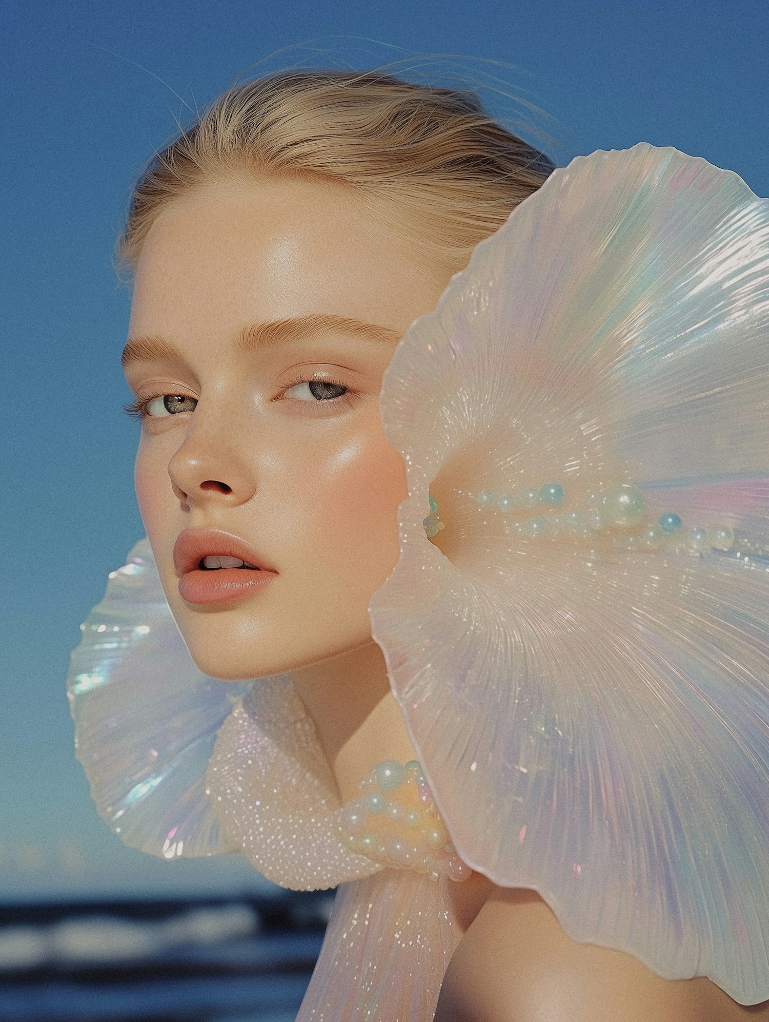 Ethereal portrait of a woman with seashell-like accessories against a clear blue sky, exuding a dreamy, coastal vibe.