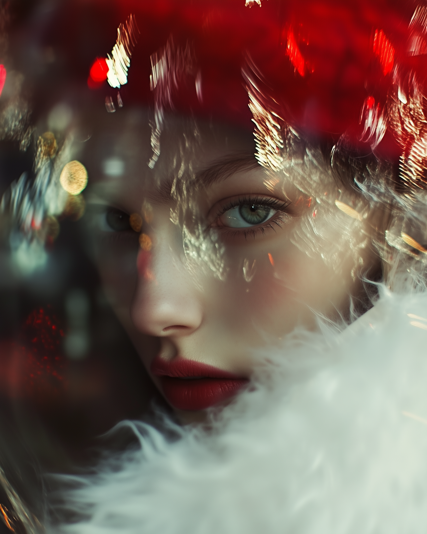 Close-up of a woman with green eyes, red lips, and white fur, framed by frosted glass and festive blurred lights.