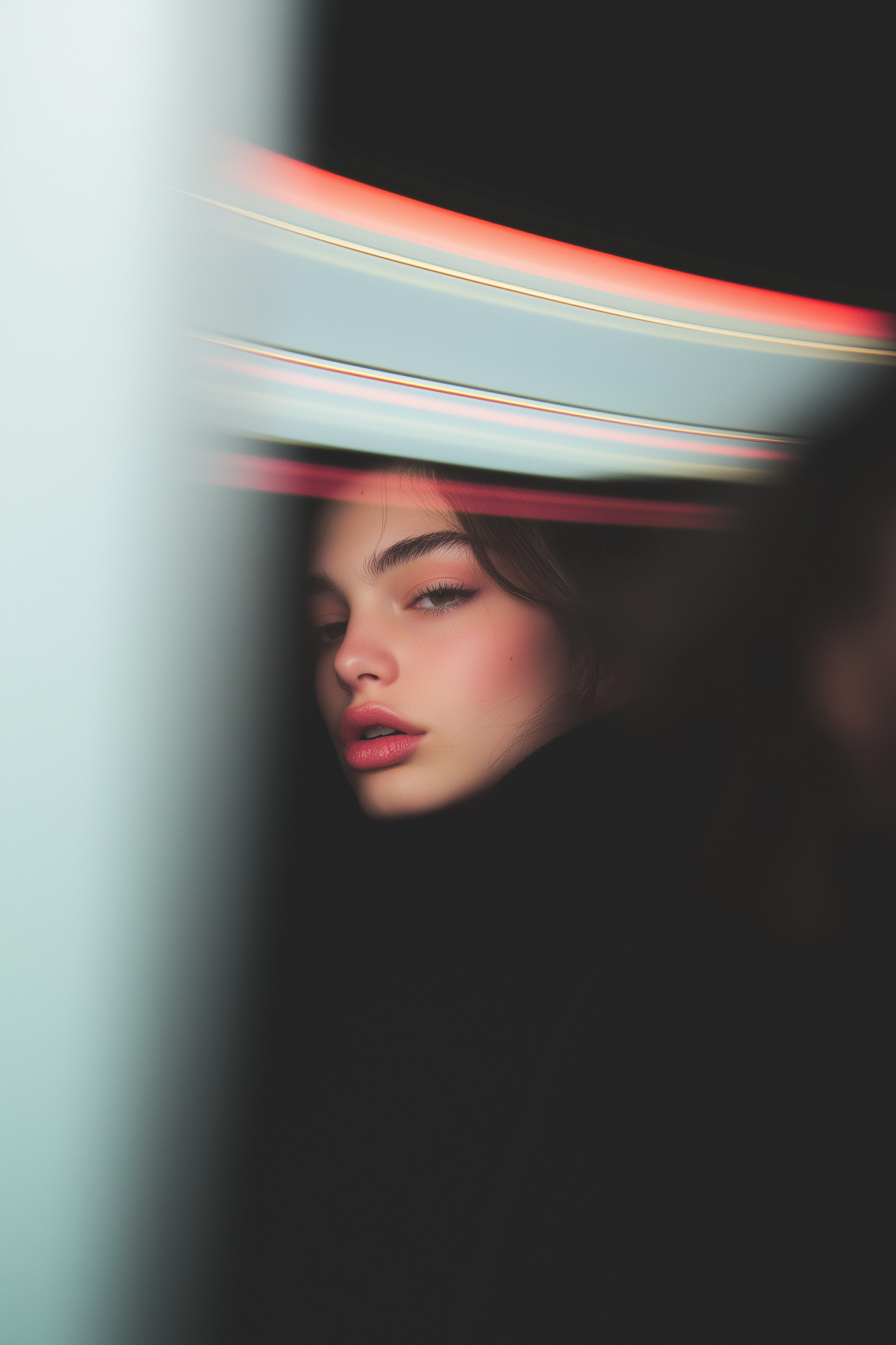 A mysterious portrait of a young woman with striking green eyes and soft pink lips, framed by dynamic light streaks in a dark setting.