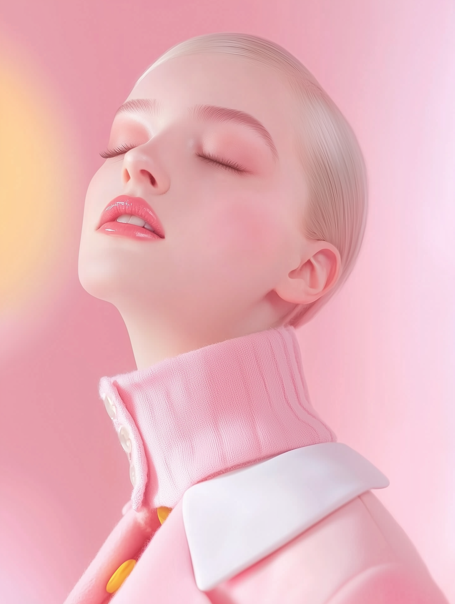 Elegant close-up of a woman with platinum blonde hair, soft pink makeup, and a high-collared pink outfit against a dreamy pink background.