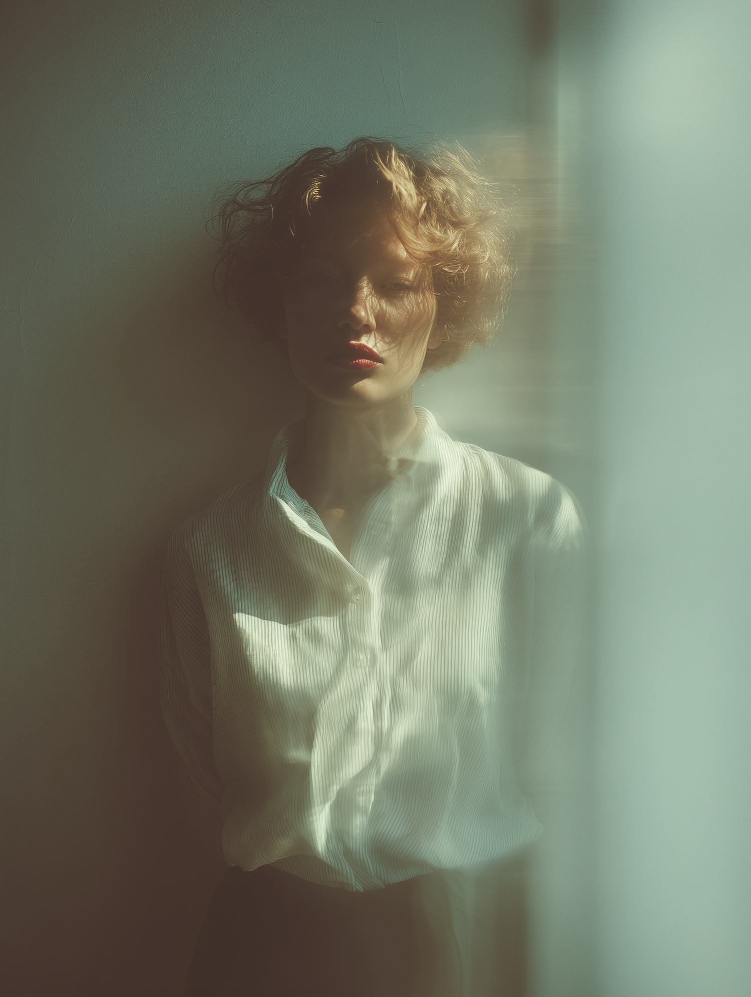 A serene portrait of a person with curly hair in soft lighting, wearing a light shirt, creating a dreamy and introspective atmosphere.