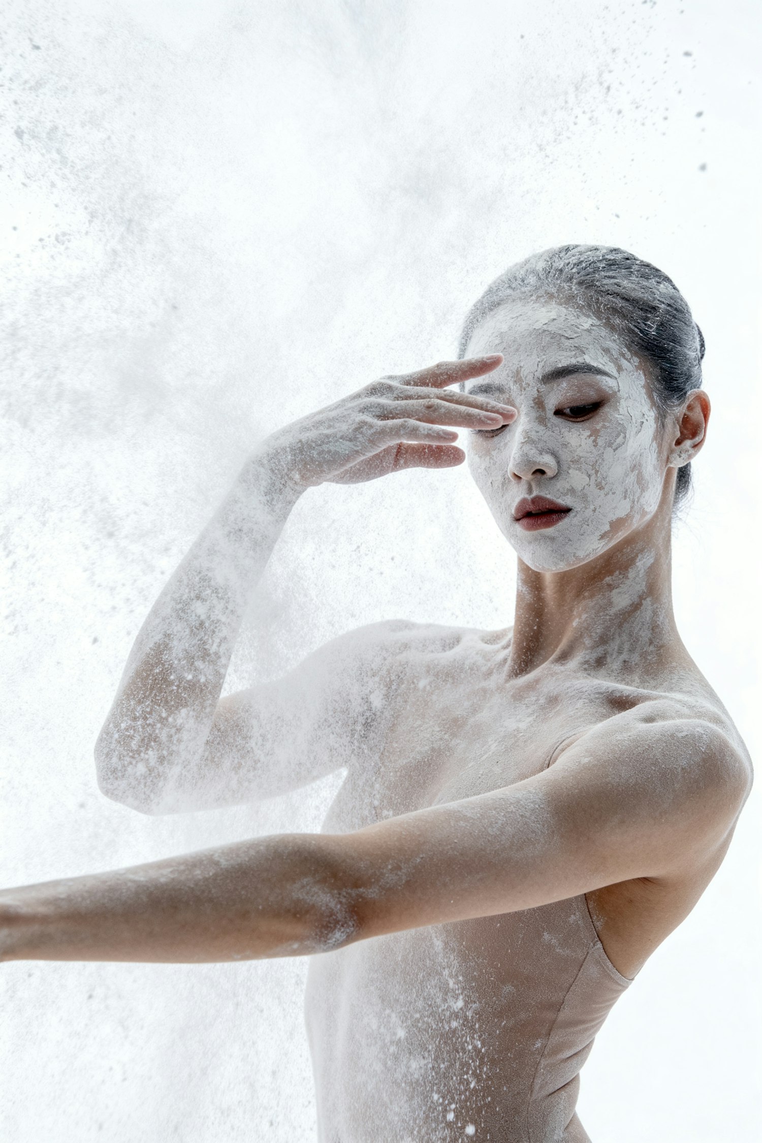 A serene woman in a dynamic pose with white powder creating a dramatic, ethereal effect against a light background.