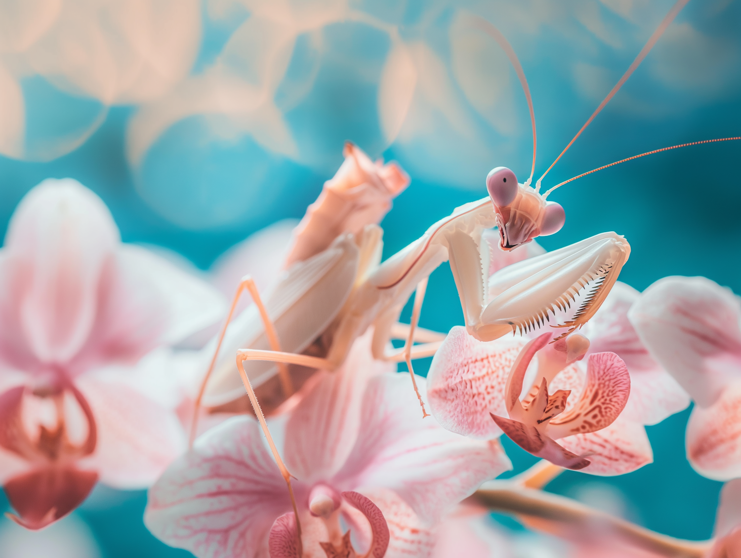 A praying mantis elegantly perched on pink orchids against a dreamy turquoise background, showcasing nature's delicate beauty.