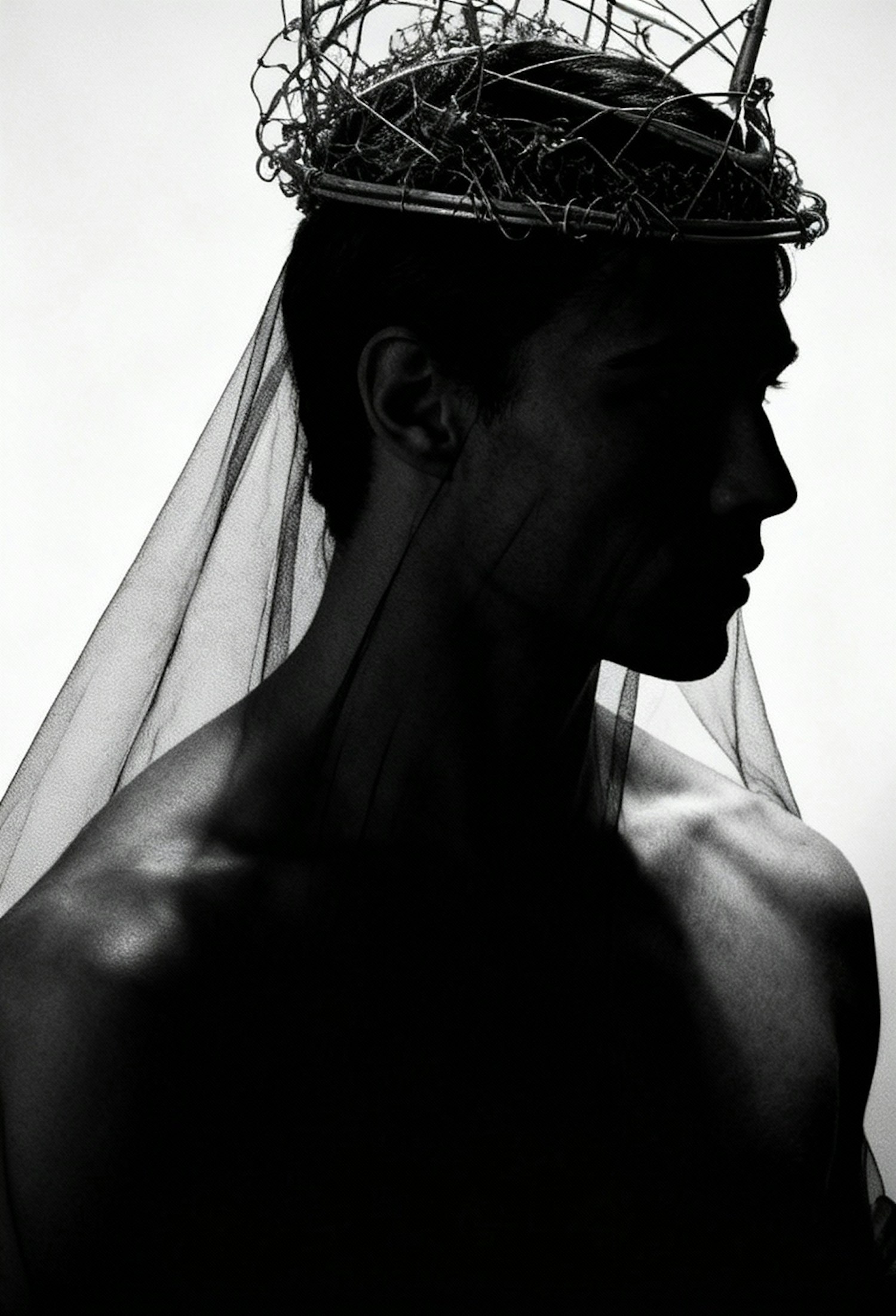 Artistic black-and-white profile of a person with a wire crown and veil, emphasizing dramatic lighting and texture.