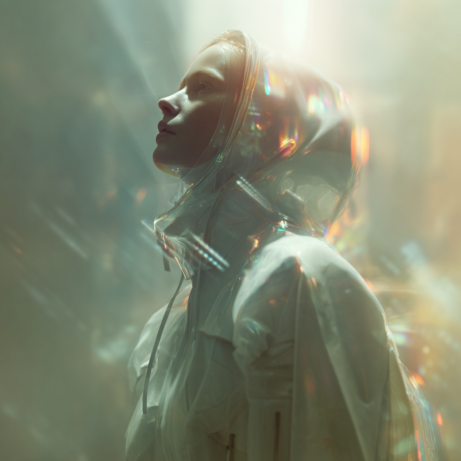 A serene profile of a person in a translucent hooded jacket, surrounded by ethereal light and prismatic reflections.