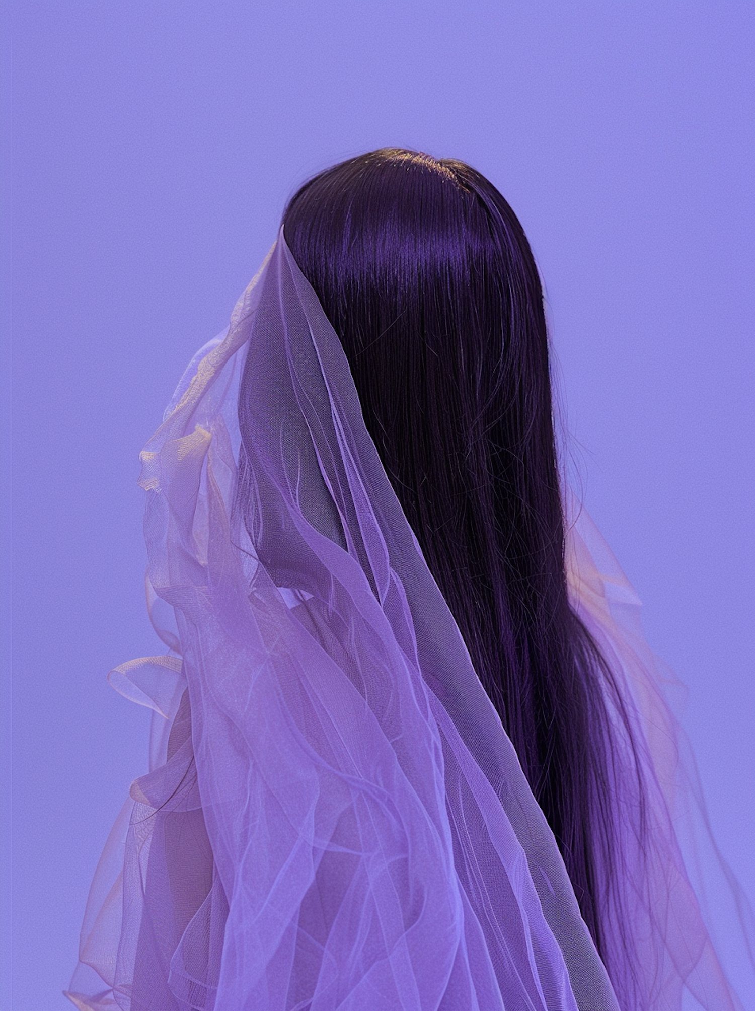 Ethereal back view of long purple hair draped with sheer lavender fabric against a vibrant purple background.