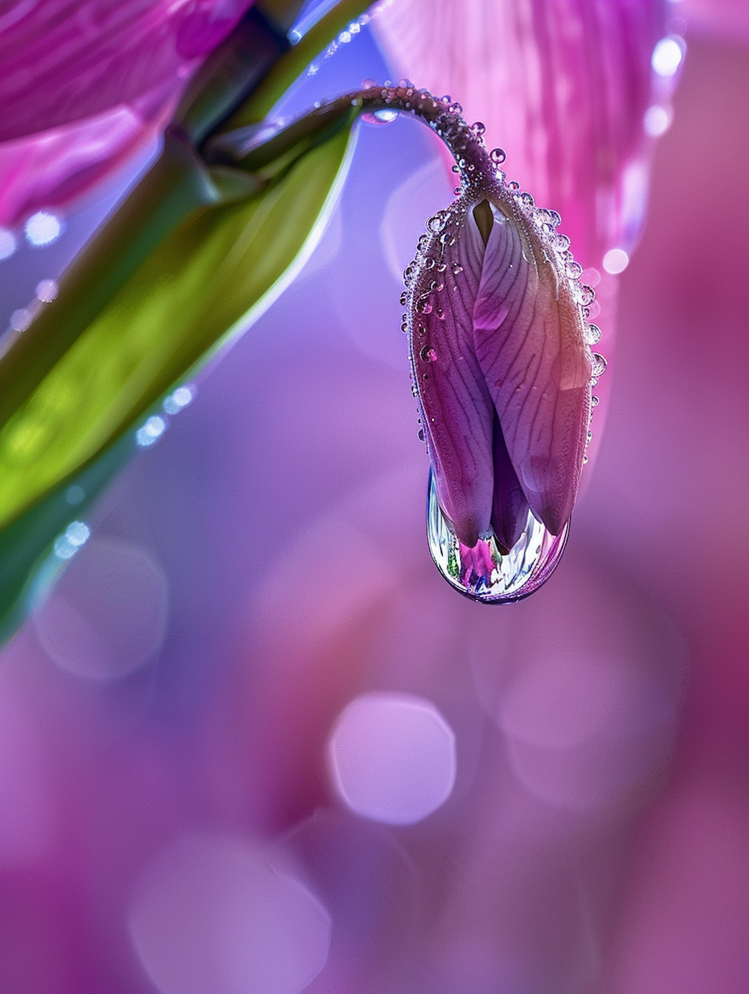 Close-up of a pink flower bud with water droplets, set against a dreamy pink and purple bokeh background.