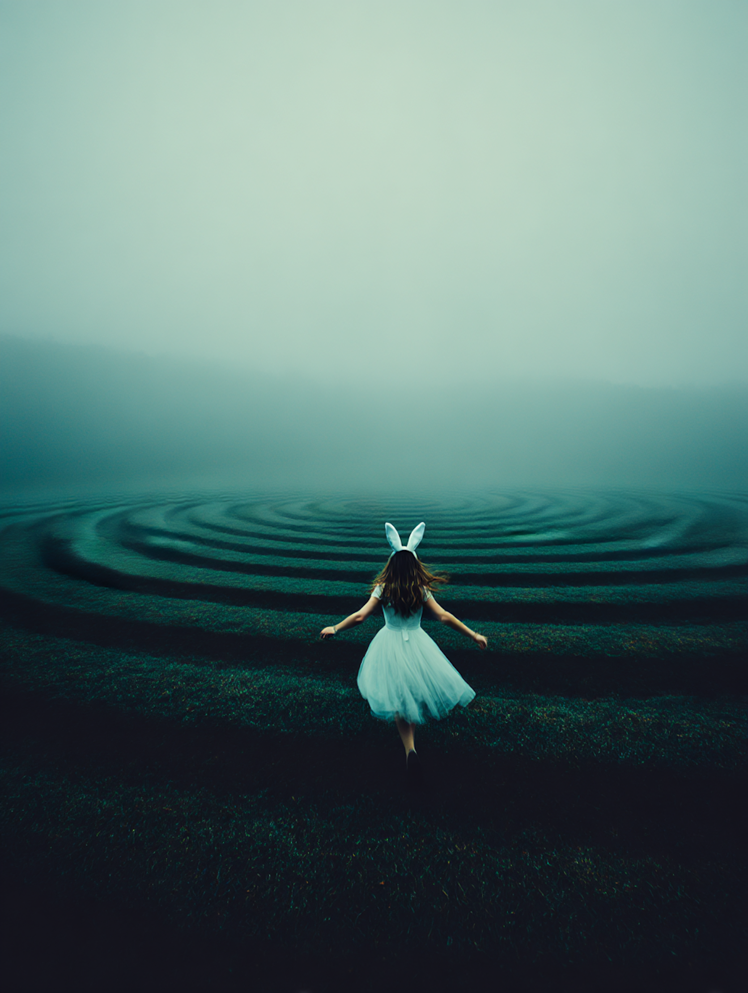 A woman in a white dress and rabbit ears stands in a misty field with concentric circles, creating a surreal and mysterious atmosphere.