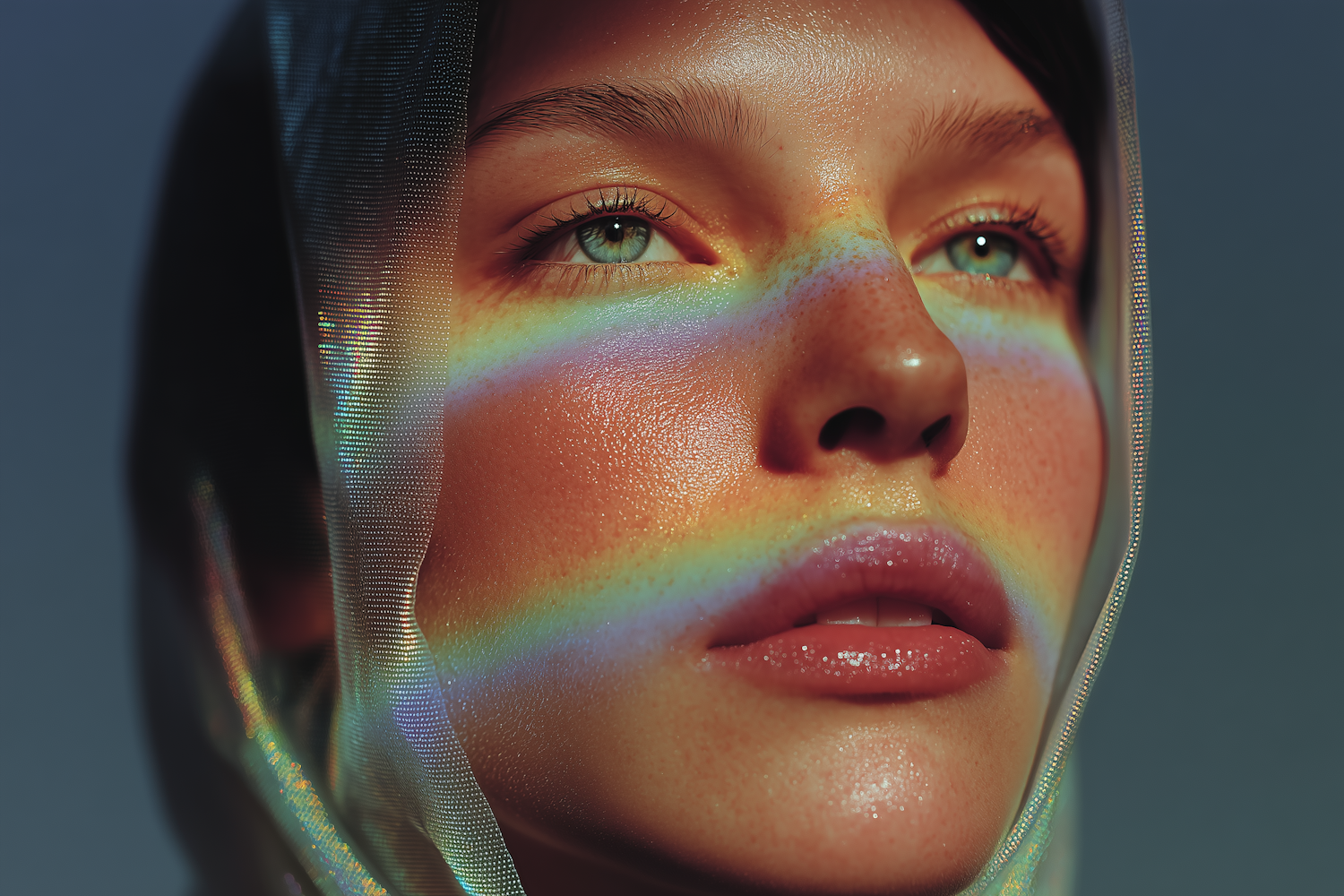 A close-up of a person with a rainbow light effect on their face, glossy lips, and a translucent fabric framing their features.