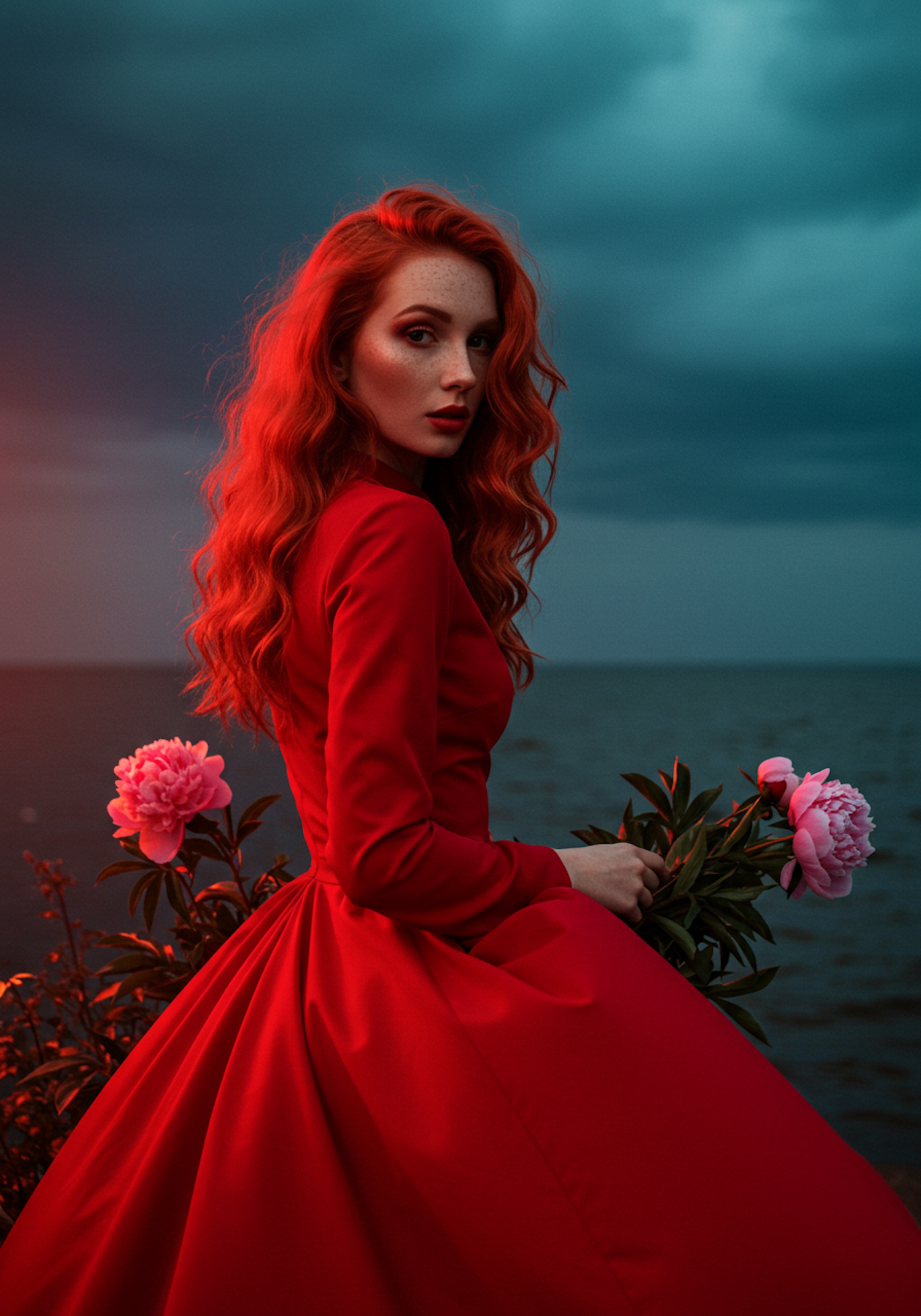 A woman with red hair in a flowing red dress holds pink peonies by a moody seascape under an overcast sky.