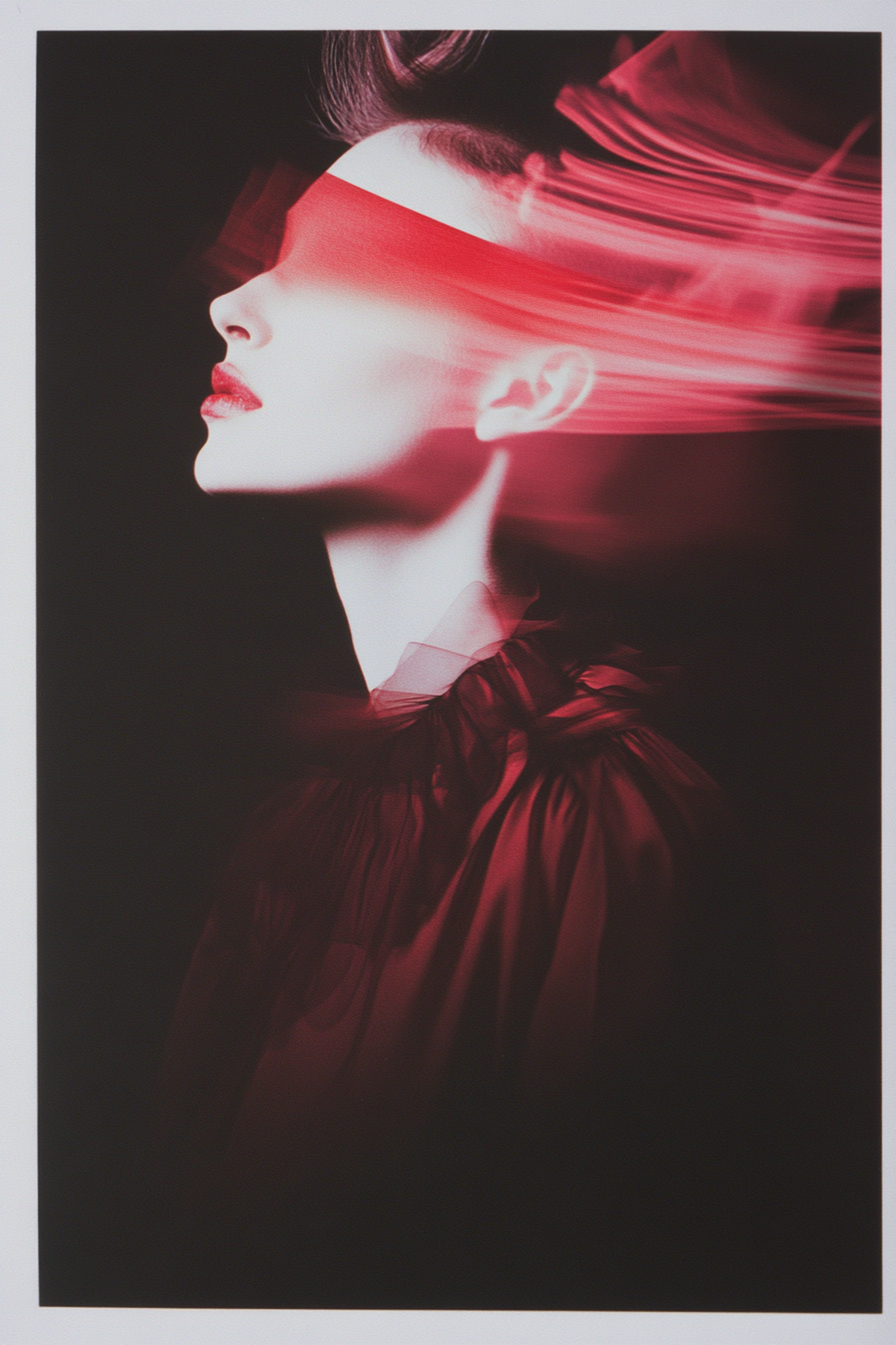 A surreal portrait with red light streaks obscuring the eyes, pale skin, red lips, and a flowing red garment against a black background.