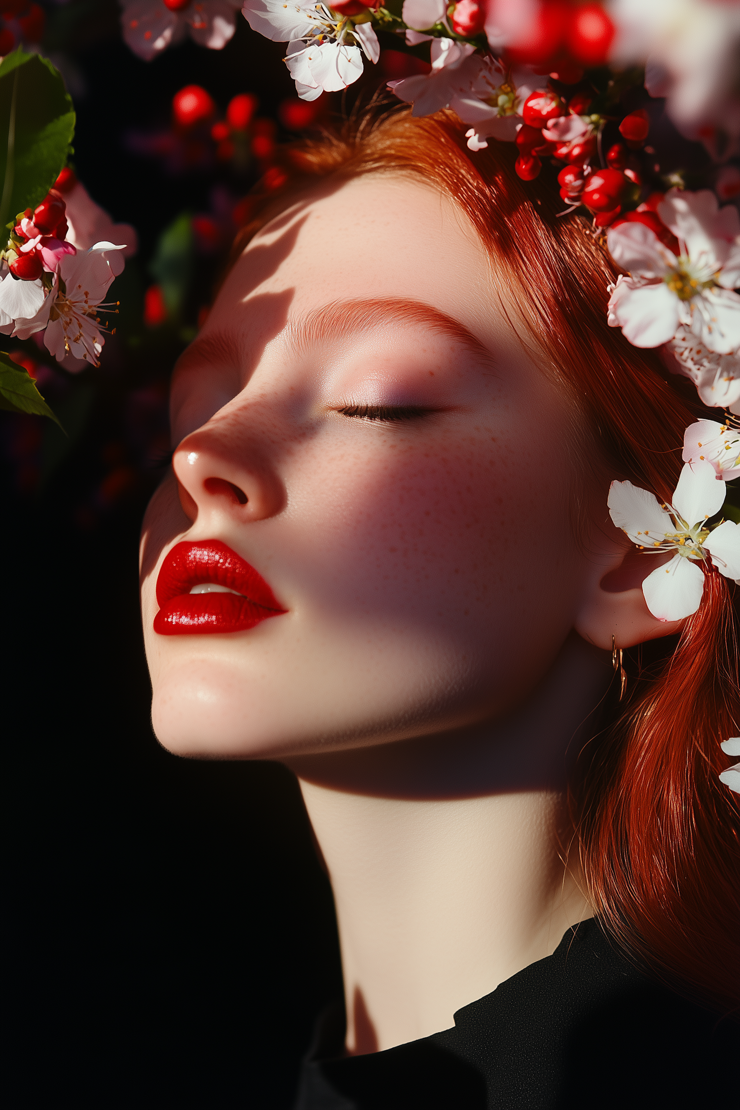 Close-up of a serene woman with red hair, bold red lips, and floral accents of white blossoms and red berries in soft sunlight.