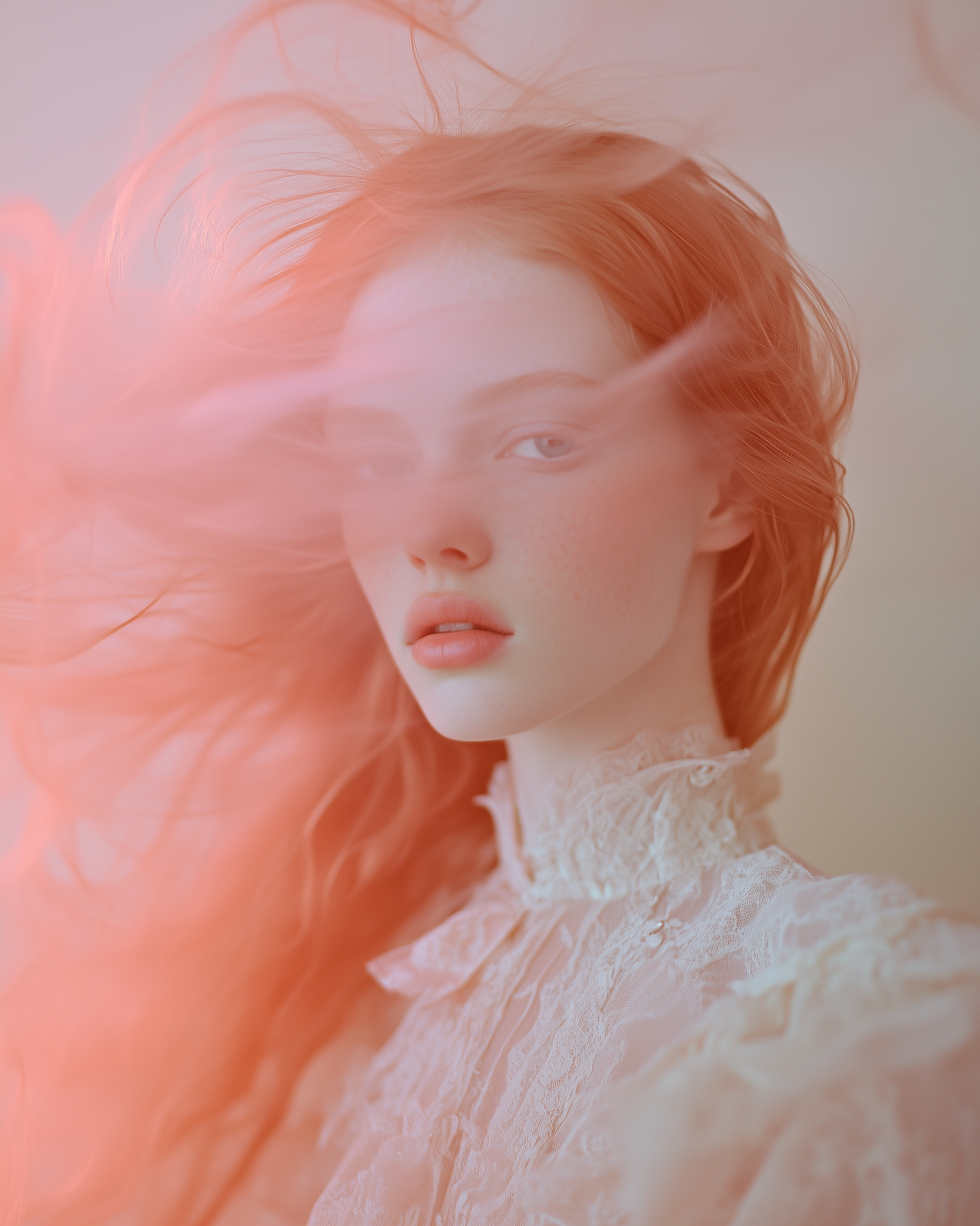 Ethereal portrait of a young woman with red hair and lace dress, enveloped in soft pink hues and a dreamy atmosphere.