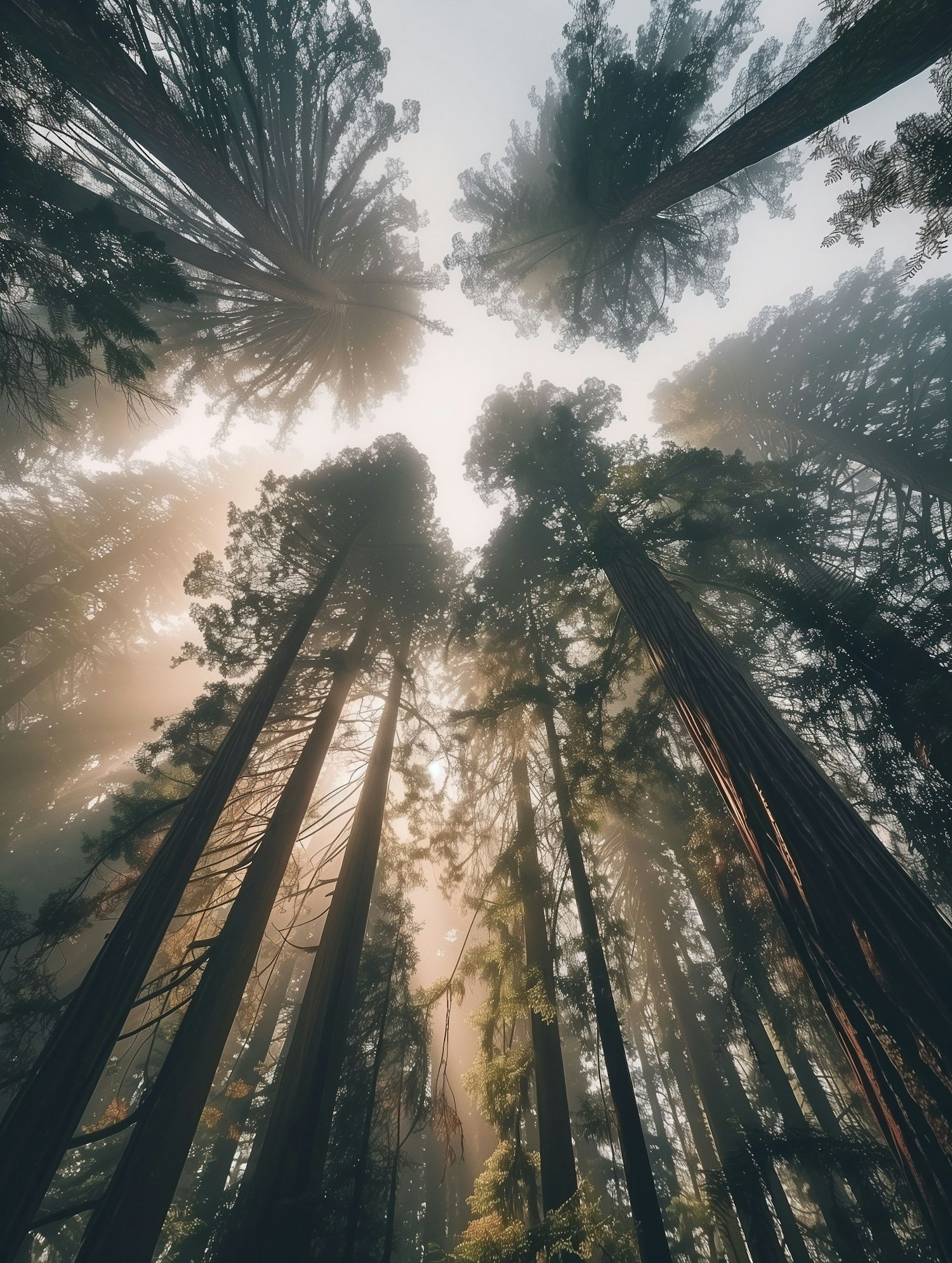 Majestic redwood trees reach skyward, bathed in ethereal sunlight and mist, creating a serene and mystical forest scene.