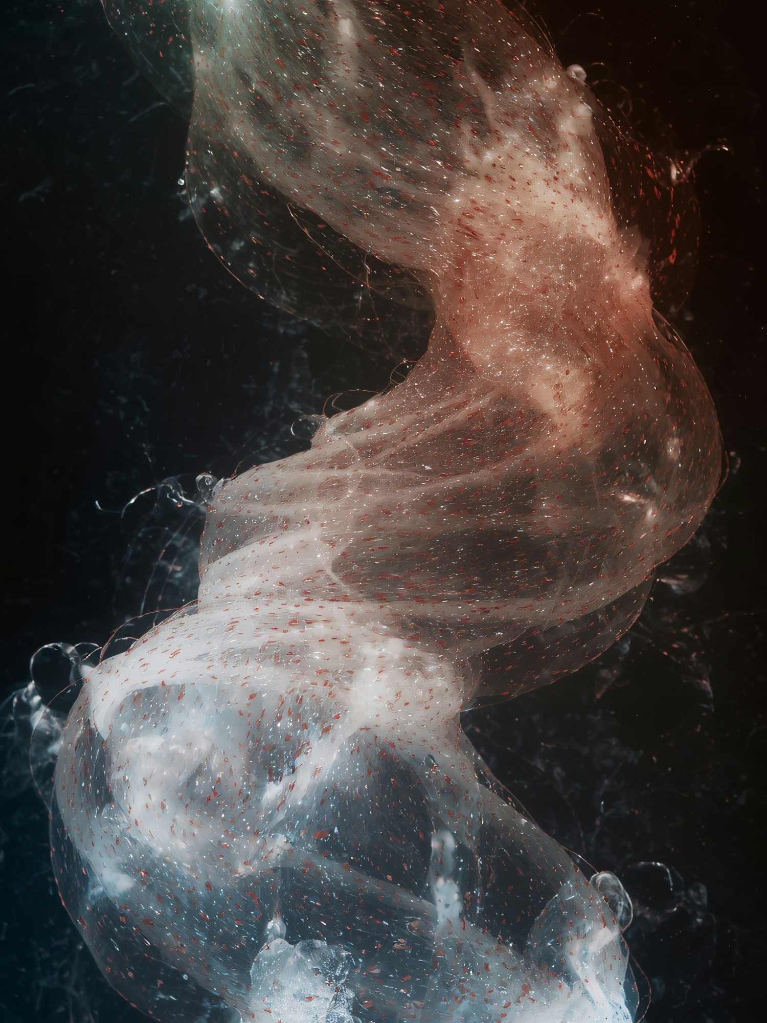 Abstract swirling translucent form with red particles, illuminated in soft hues of white, blue, and red against a dark background.