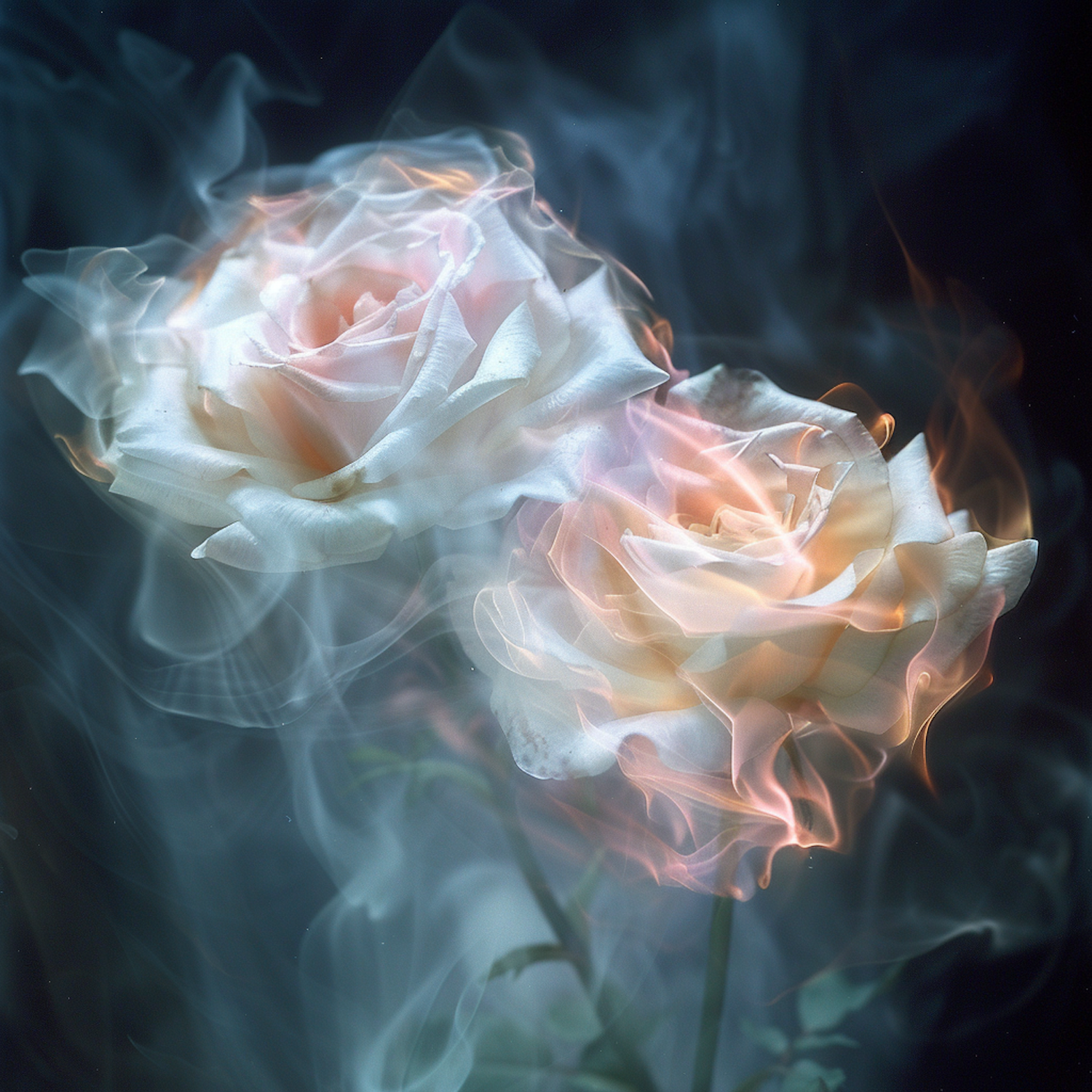 Two ethereal white roses surrounded by mystical smoke, creating a dreamlike and enchanting atmosphere.