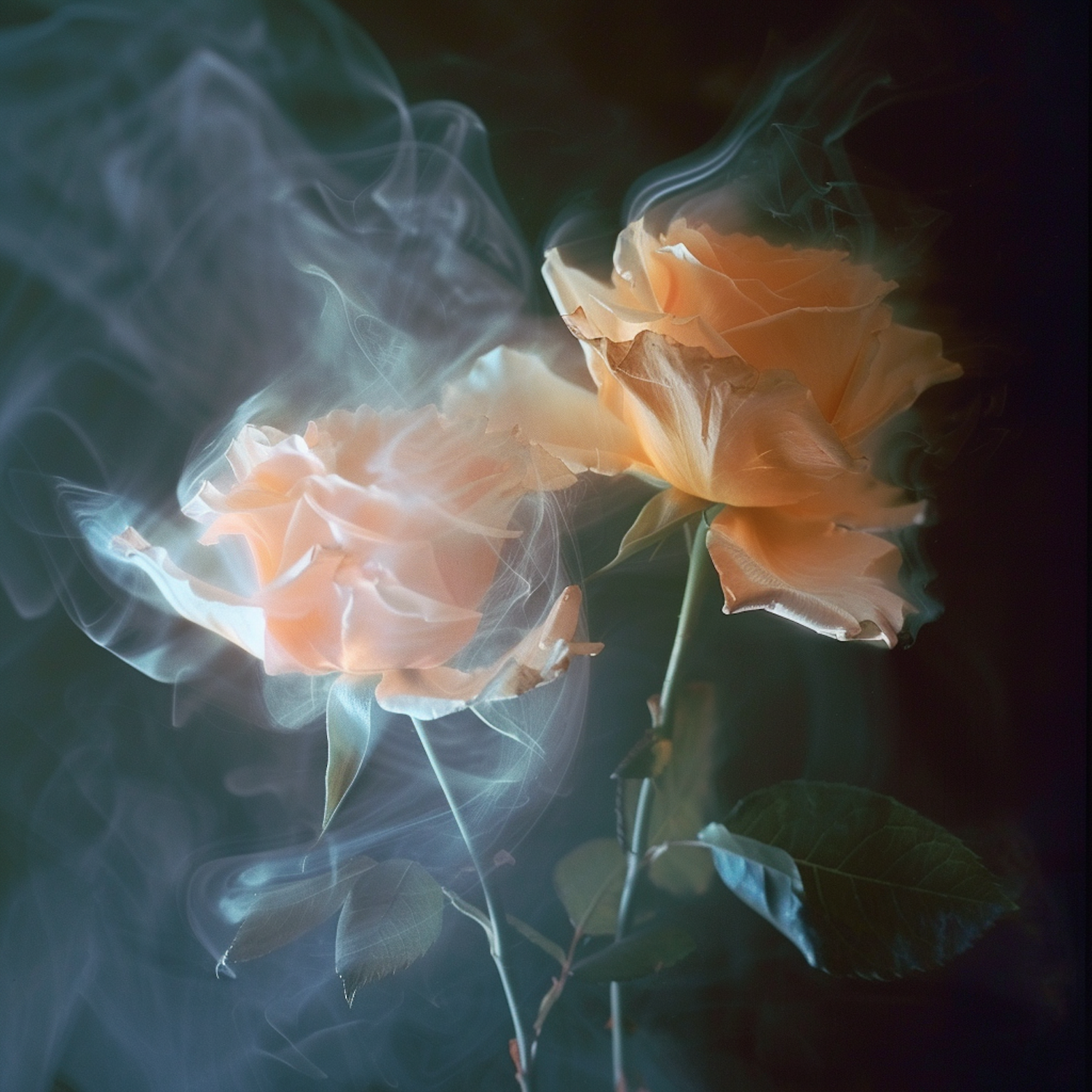 Ethereal peach roses surrounded by mystical smoke, creating a dreamlike and elegant atmosphere.