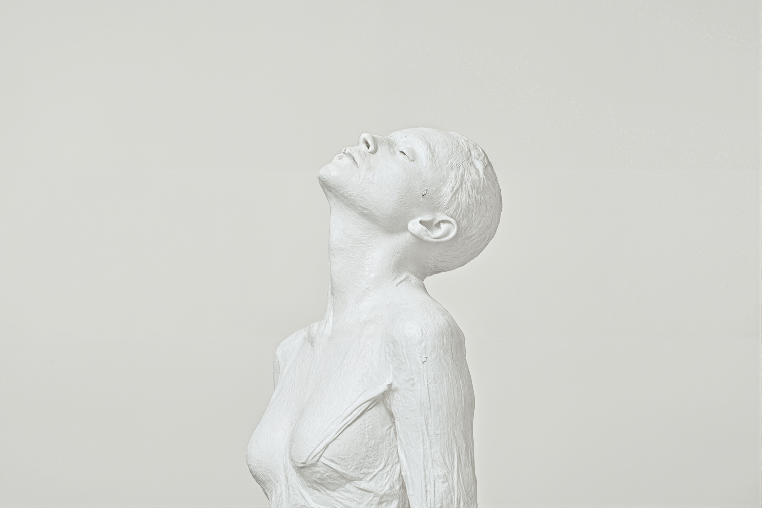 Monochromatic sculpture of a serene figure with head tilted back, eyes closed. Smooth, polished texture in a minimalist setting.