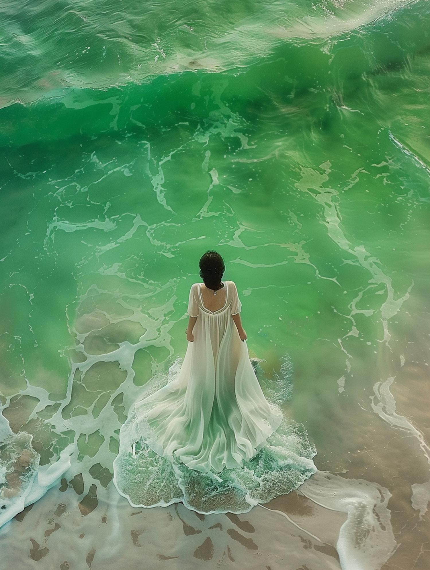 Woman in a flowing white dress stands at the ocean's edge, surrounded by vibrant green waves and foamy water.