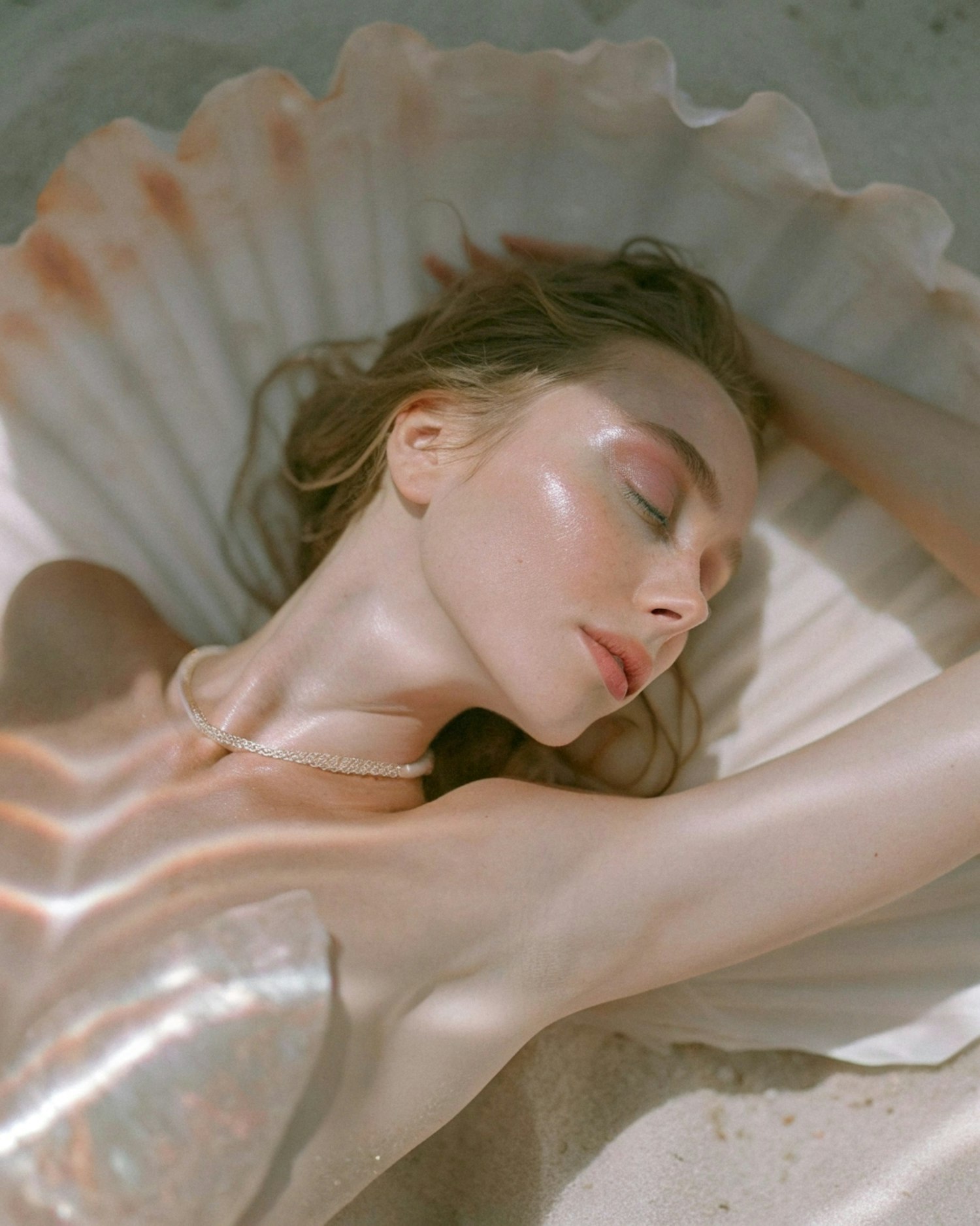 A serene woman rests in a seashell, her glowing skin and delicate necklace creating a tranquil, ethereal scene.
