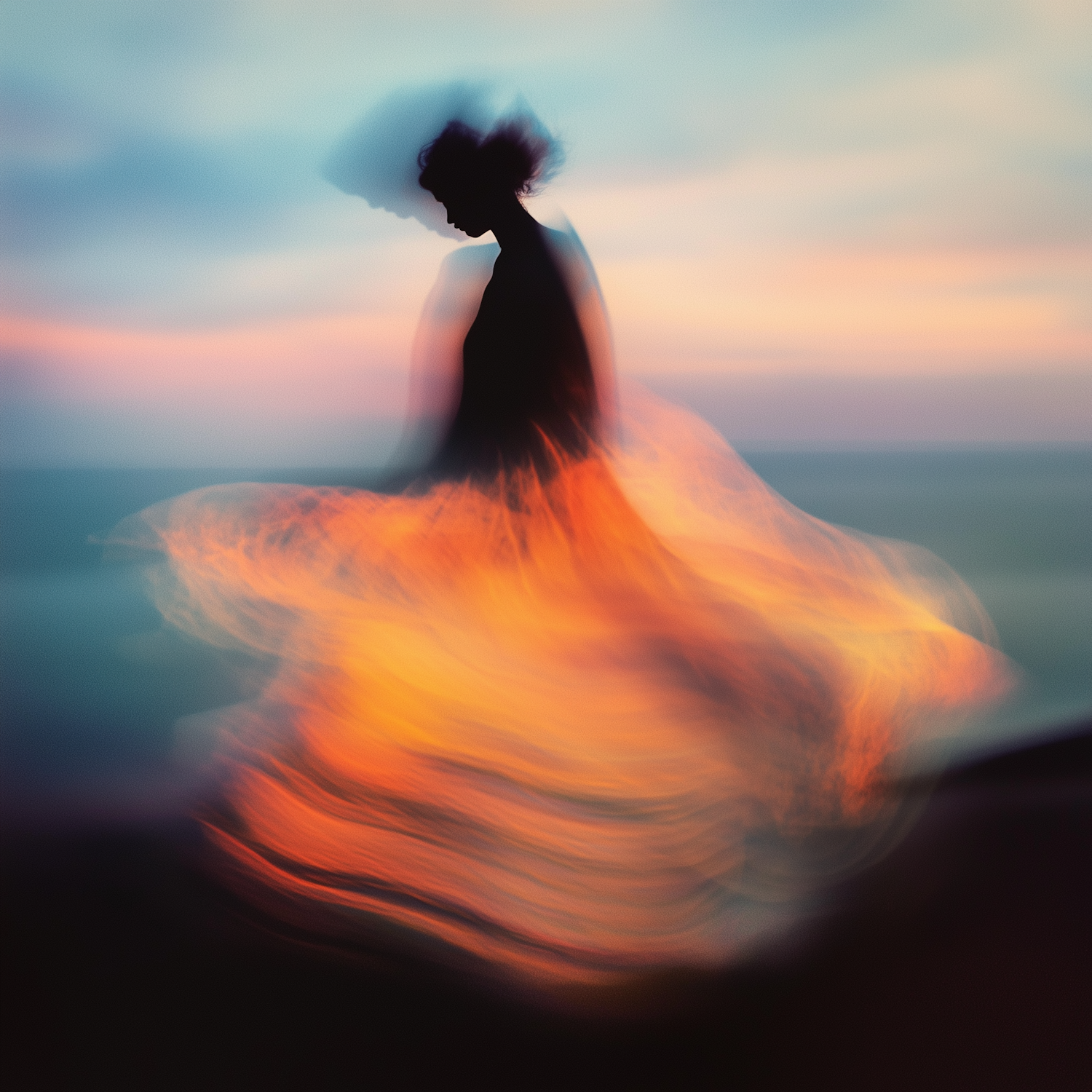 A blurred silhouette of a figure in motion, with fiery orange tones blending into a dreamy sunset background of blue and pink hues.