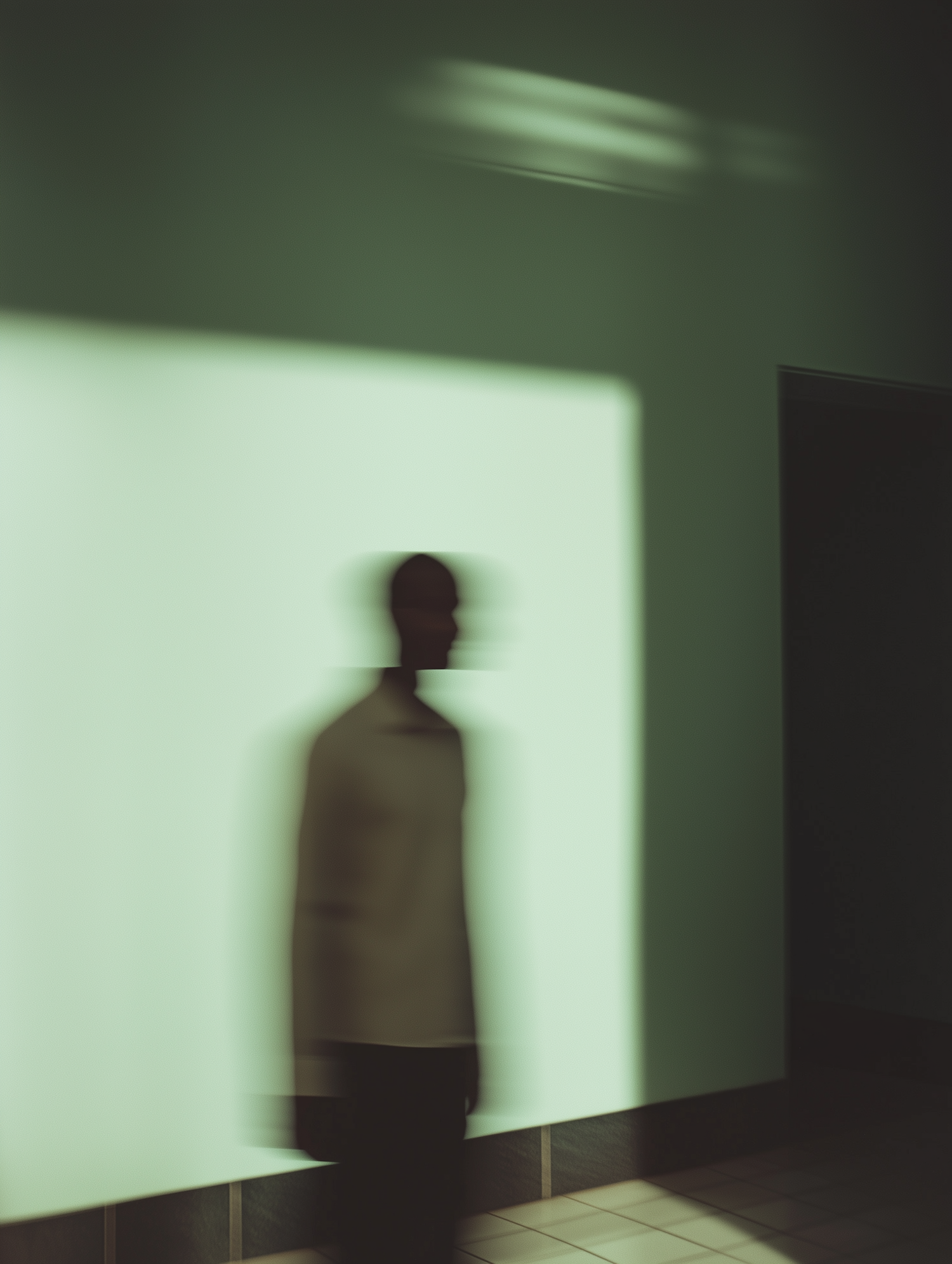Blurred silhouette against a softly lit green wall, creating an ethereal and mysterious atmosphere with muted colors and intriguing lighting.