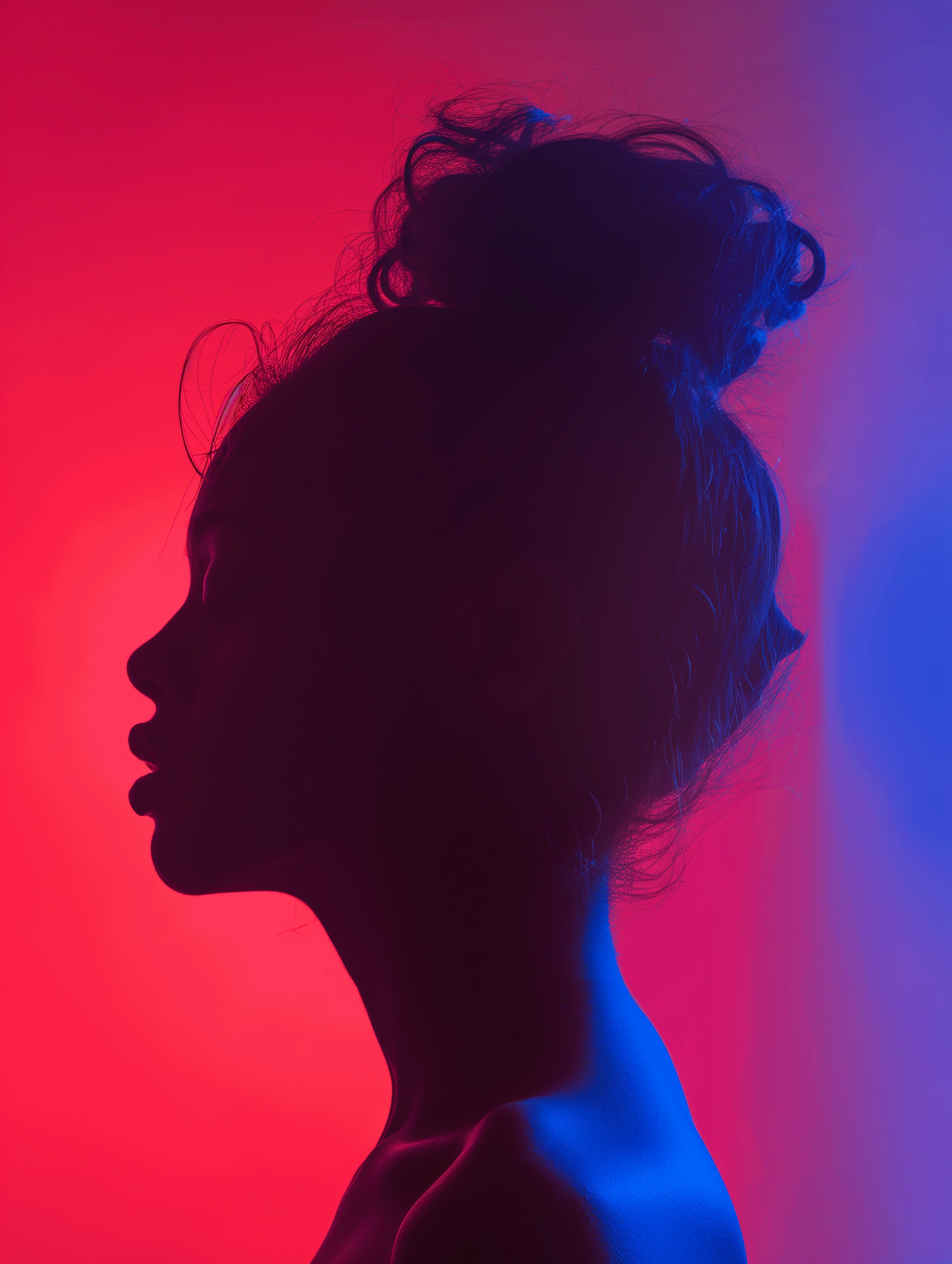 Silhouette of a person with a bun against a vibrant red and blue background, creating a dramatic contrast.