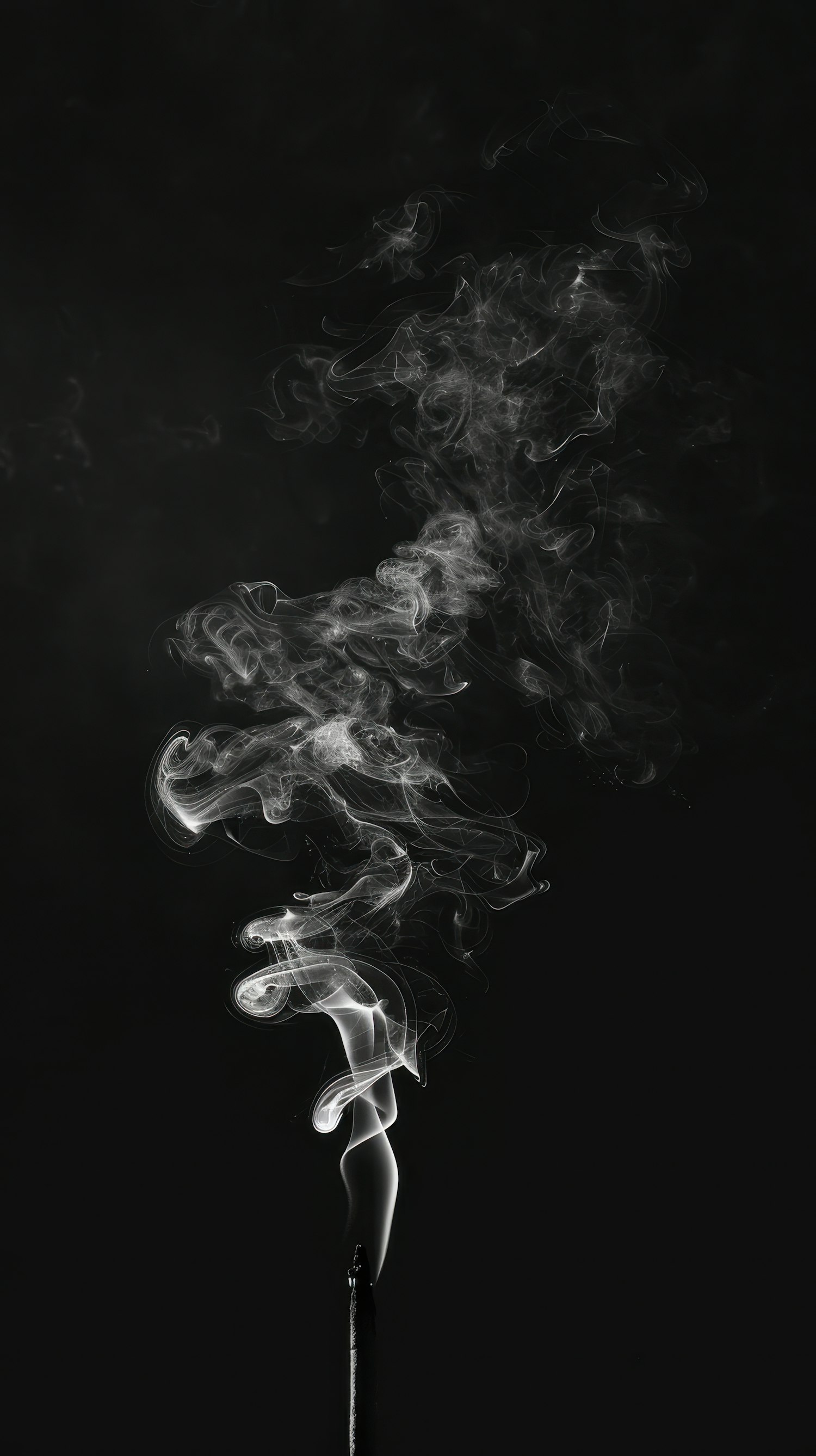 Ethereal white smoke swirls gracefully from an incense stick against a dark background, creating a mesmerizing visual effect.