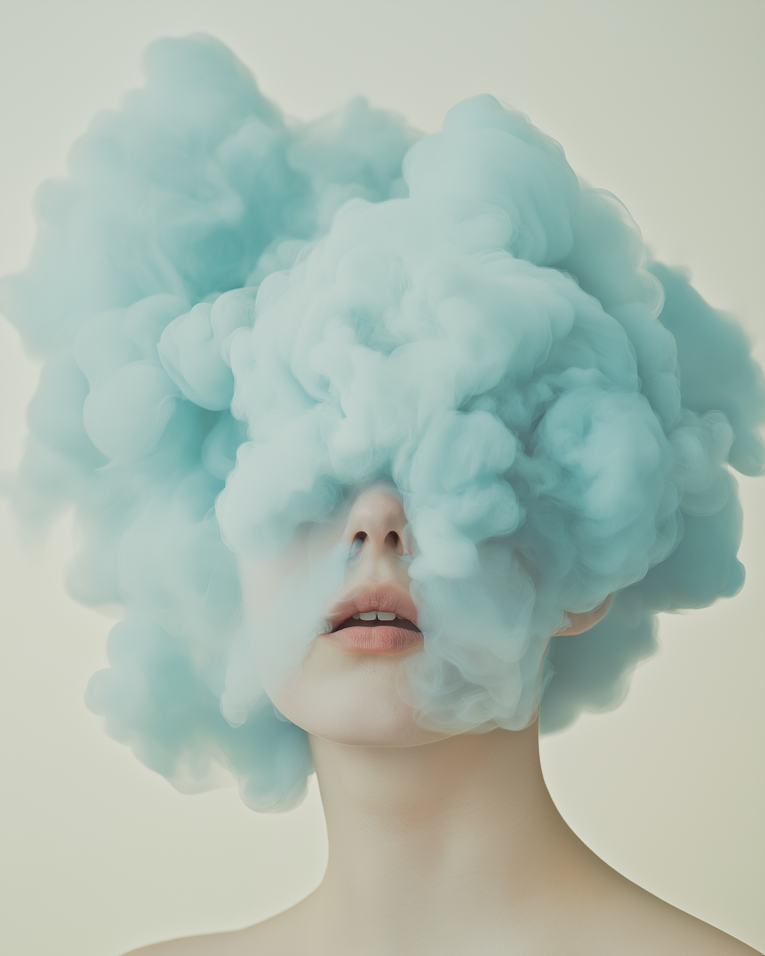 A surreal portrait of a person with light blue smoke obscuring their face, creating a dreamy and ethereal vibe.
