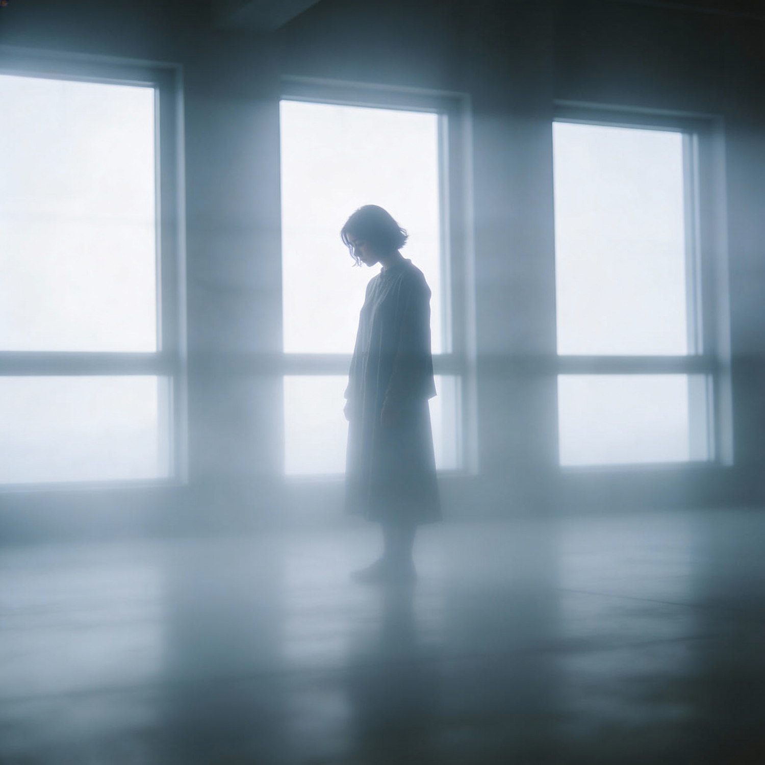 A lone figure stands in a misty room with large windows, creating a serene and introspective atmosphere.