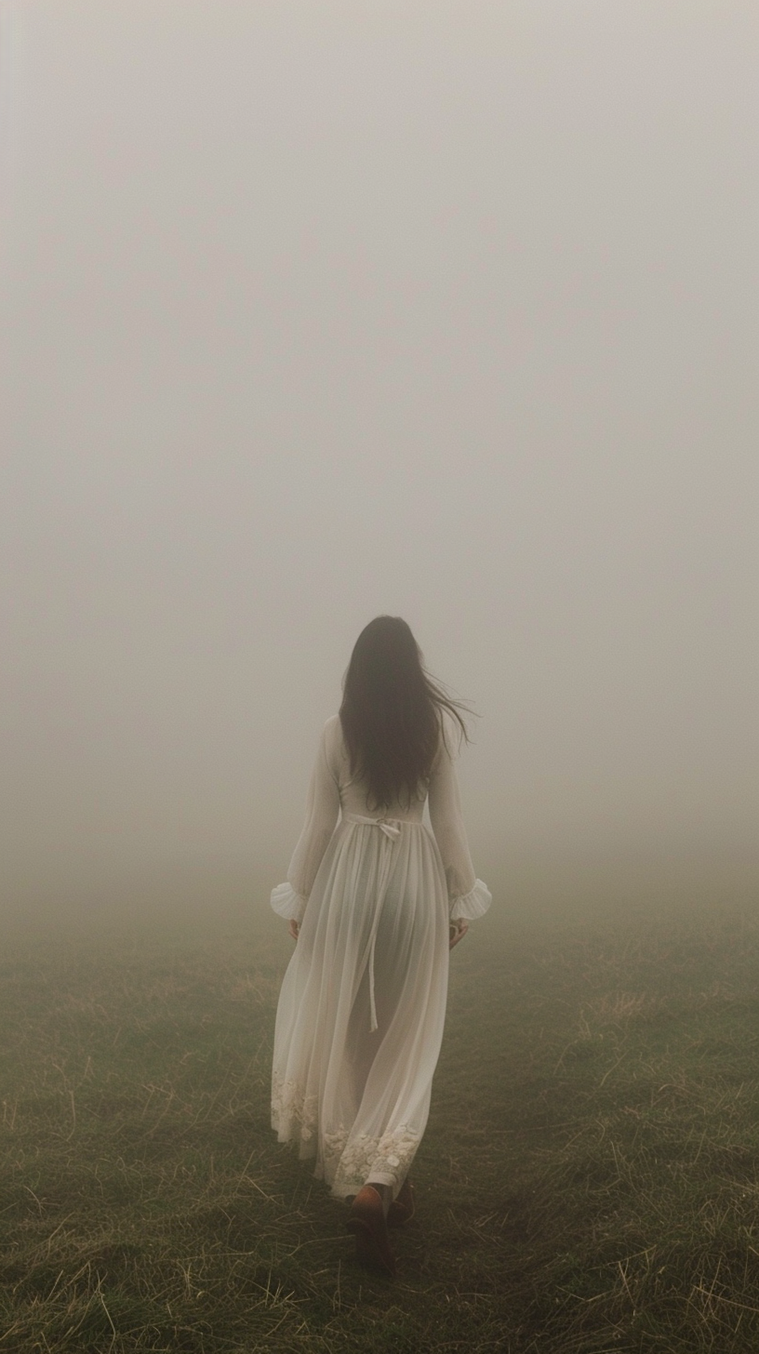 A woman in a flowing white dress walks into a foggy landscape, creating a mysterious and serene atmosphere.
