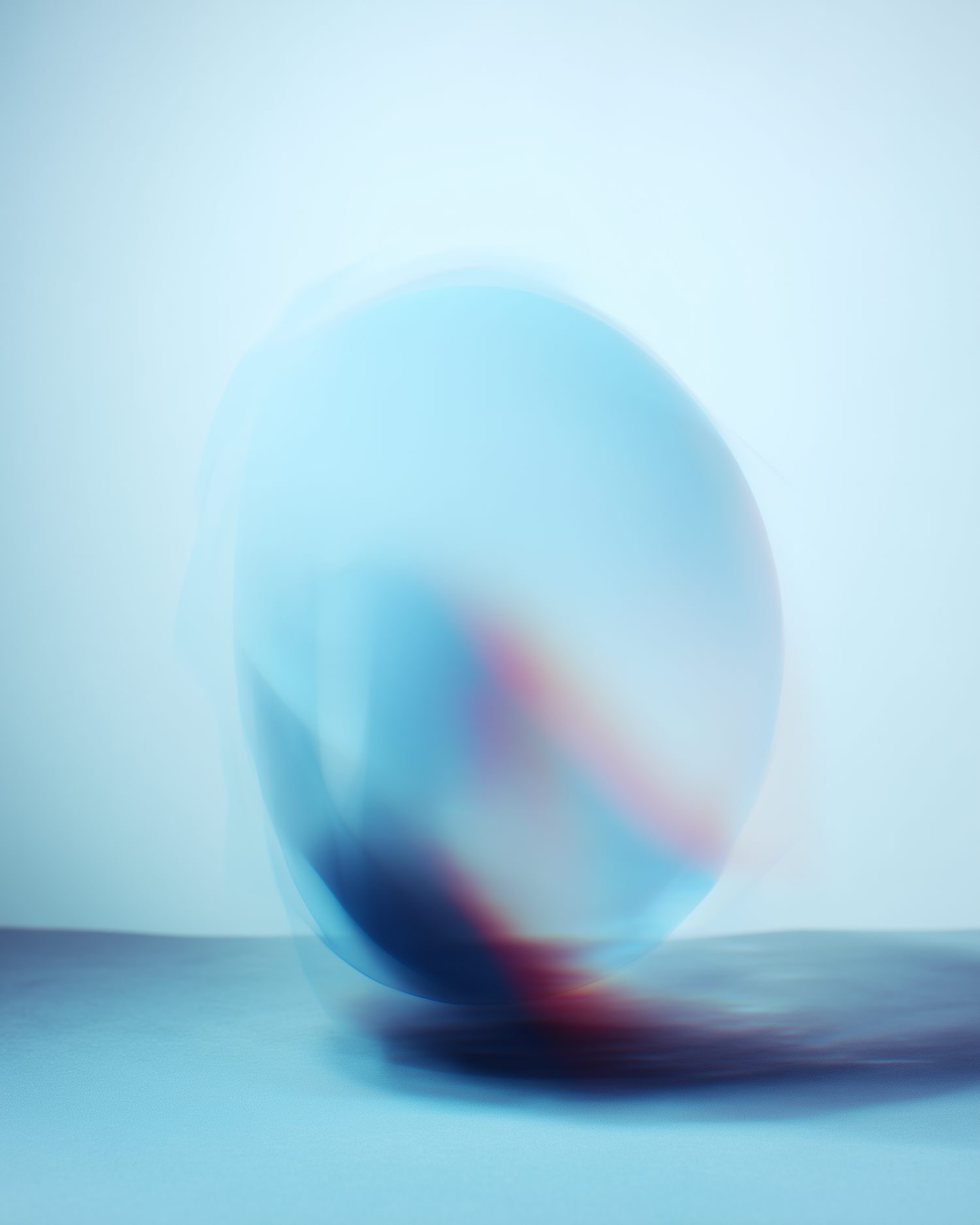 Abstract image of a glowing, blurred sphere in motion with soft blue, red, and purple hues on a minimalist light blue background.