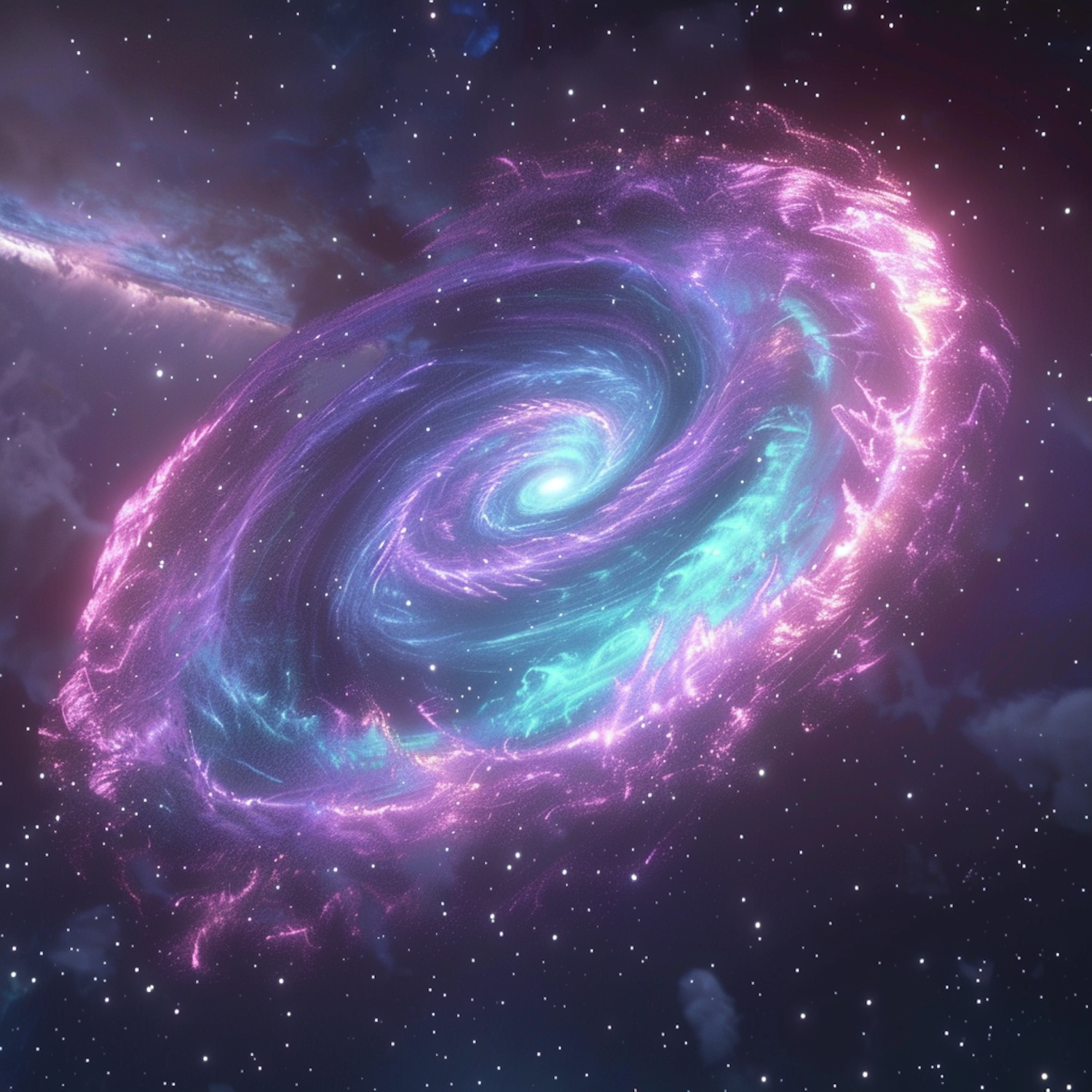 A vibrant spiral galaxy with pink, purple, and blue hues, set against a starry cosmic background, creating a mesmerizing space scene.