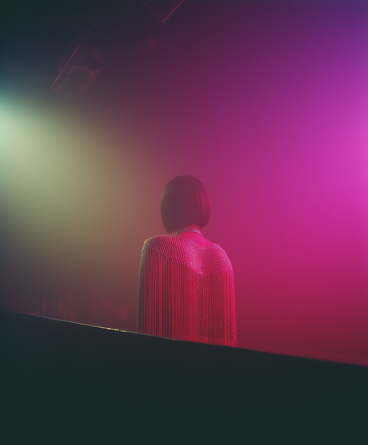 A person in a beaded cape stands under pink and green stage lights, creating a dreamy, ethereal atmosphere with hazy fog.