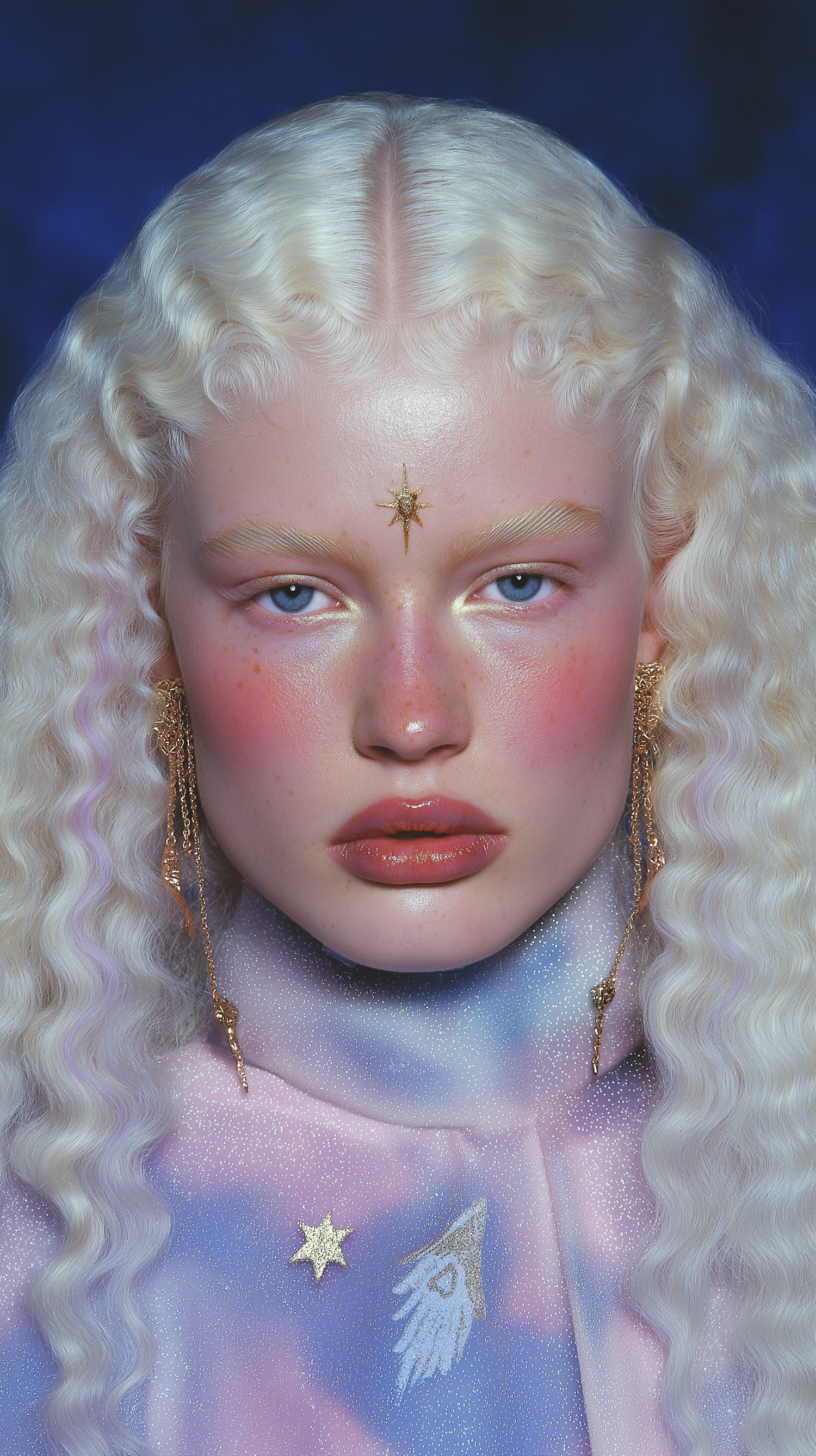 Close-up of a person with platinum blonde hair, celestial-themed attire, and golden star accessories, set against a deep blue background.