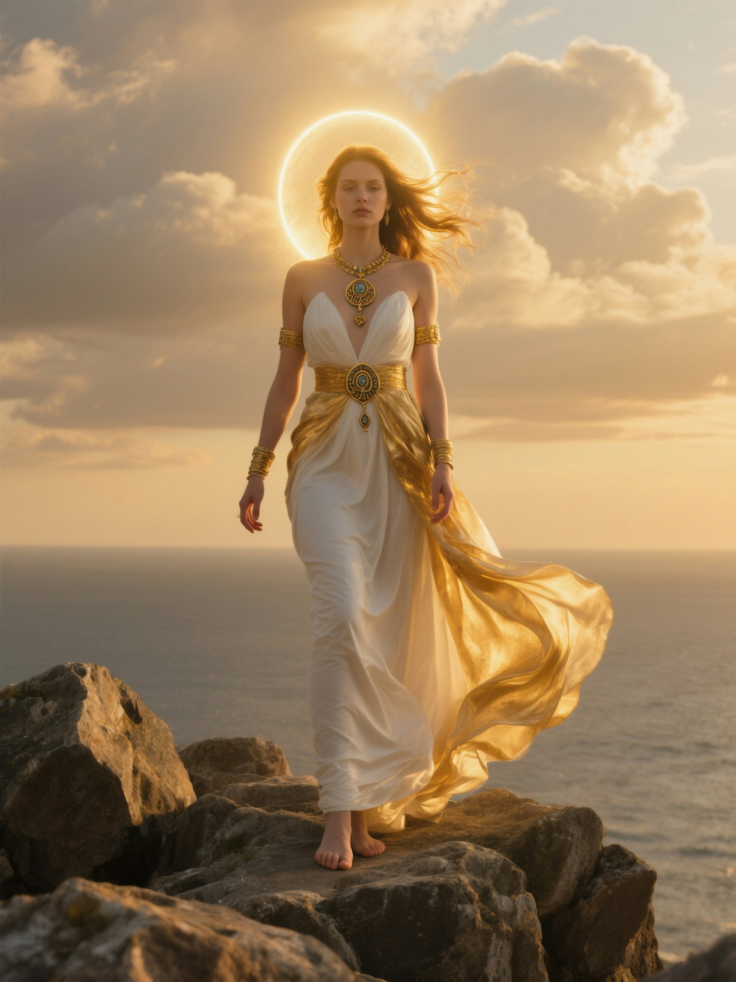 Editorial fine art photography, mythological and timeless aesthetic, golden sunlight creating a soft halo, cinematic clouds in the background, warm tones, glowing skin, dramatic light and shadow play, ethereal and divine atmosphere, ultra realistic, high resolution, full body of a woman standing barefoot on jagged rocks overlooking the horizon, wearing a flowing gown of white silk and golden drapery that cascades like waves, hair windswept into a glowing halo, adorned with bold jewelry shaped like ancient amulets, composition dramatic and monumental, evoking a goddess commanding the elements.