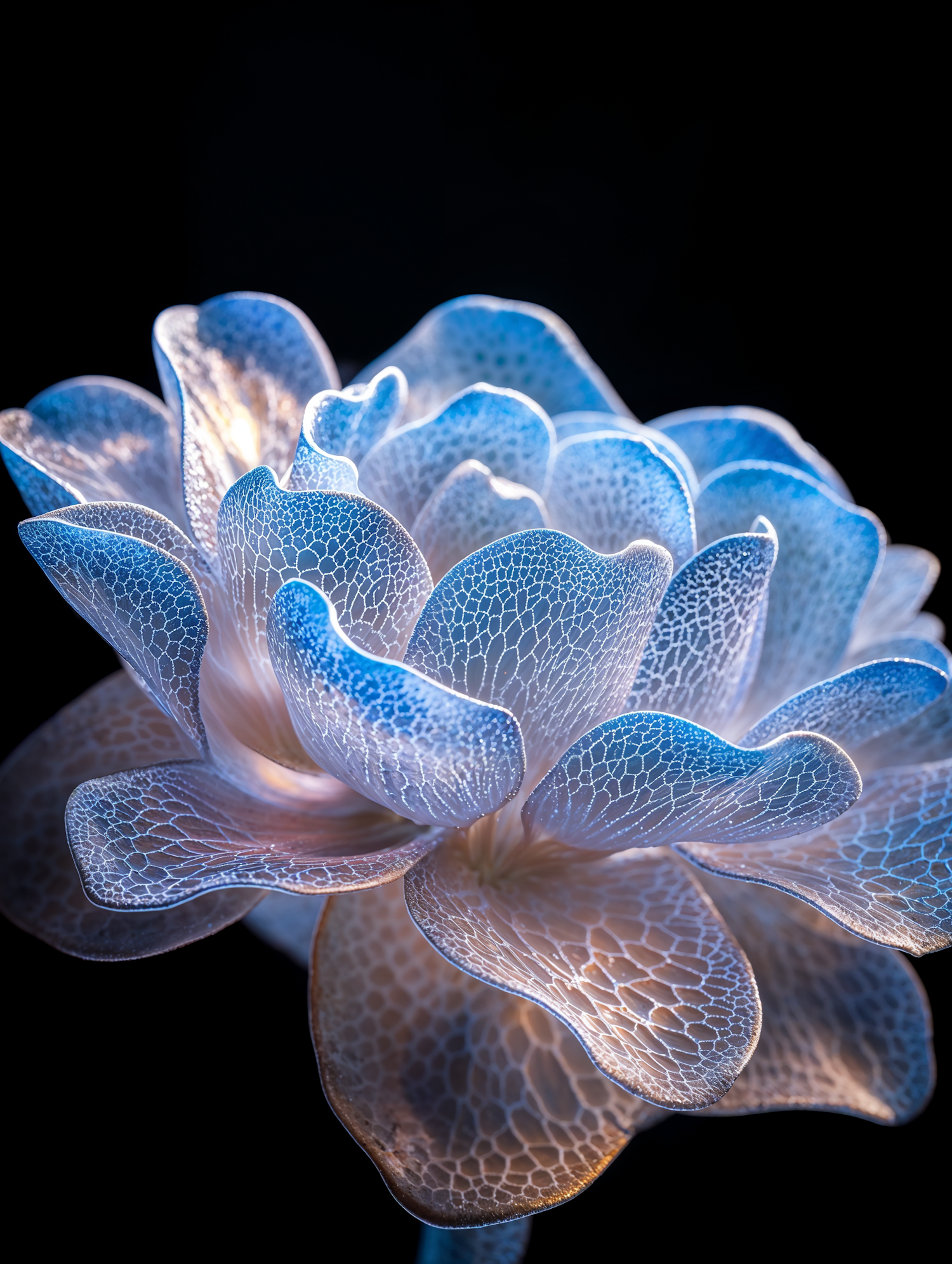 Close-up of a glowing translucent flower with intricate blue and white petal patterns against a black background.